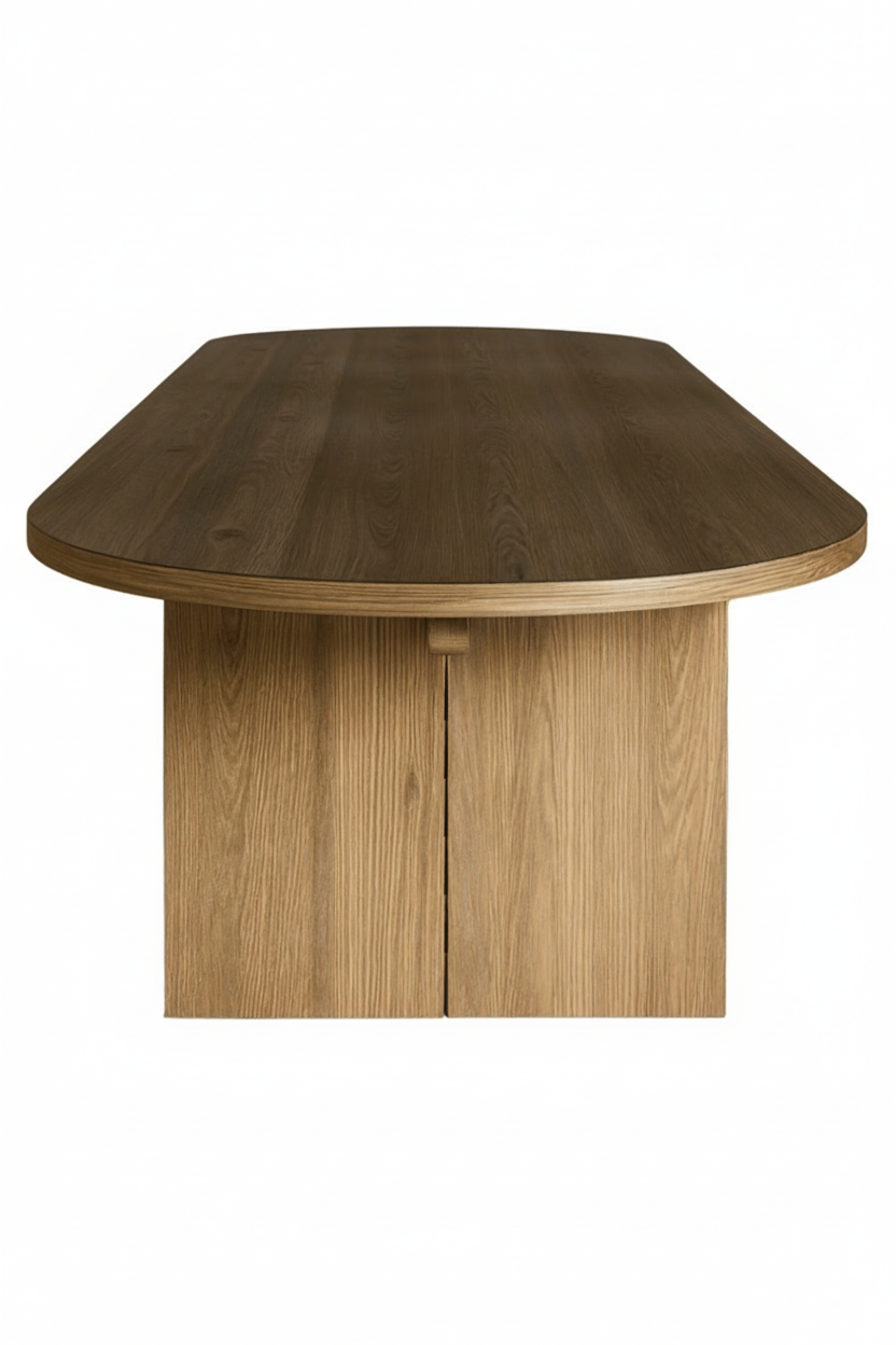 La Mesa Valentina de Casa Castañas es una pieza de carpintería artesanal elaborada en madera sólida de rosa morada con acabado matte. Su forma ovalada retoma una geometría tradicional y la reinterpreta mediante proporciones limpias y detalles de diseño contemporáneos, logrando una presencia equilibrada y atemporal en el comedor.