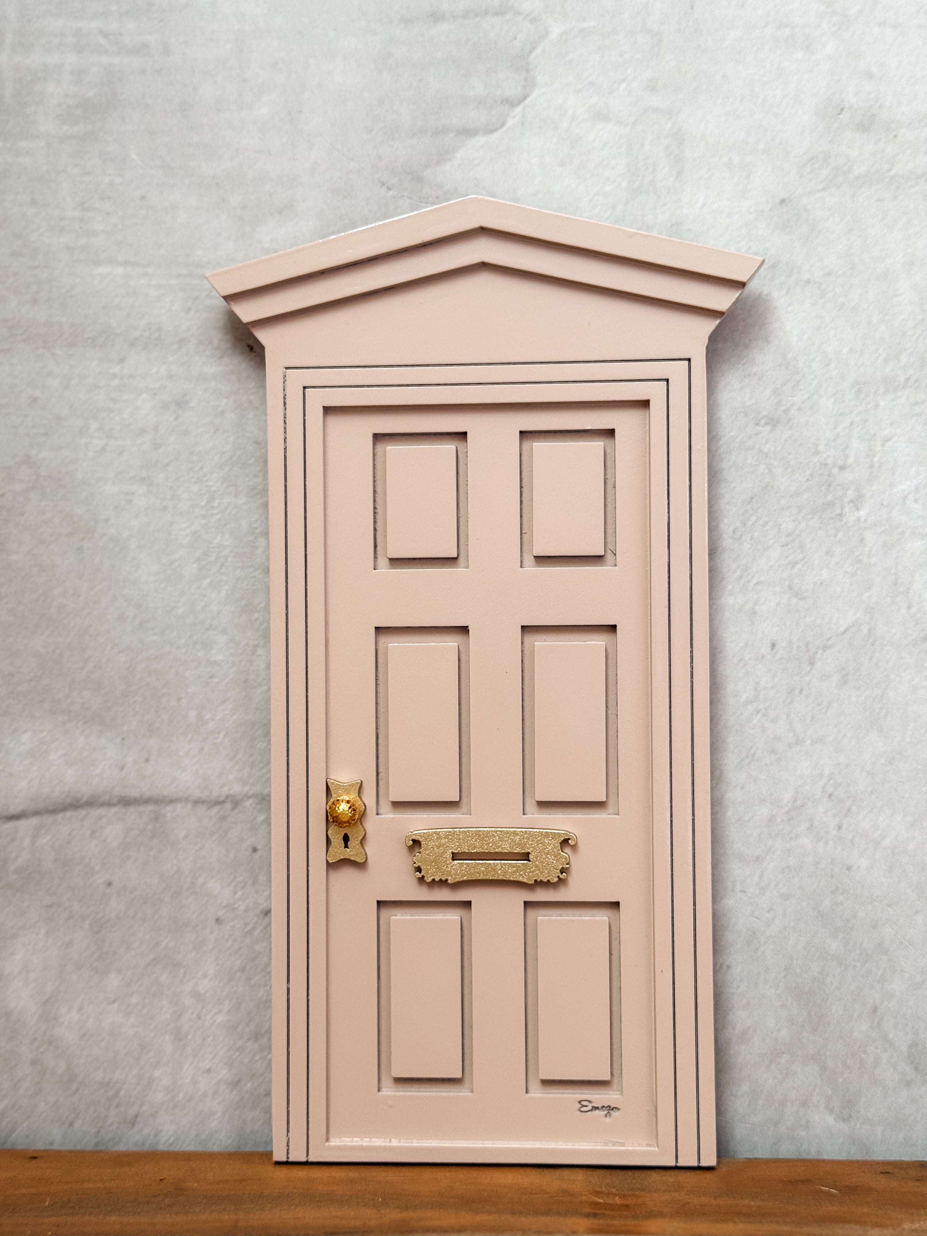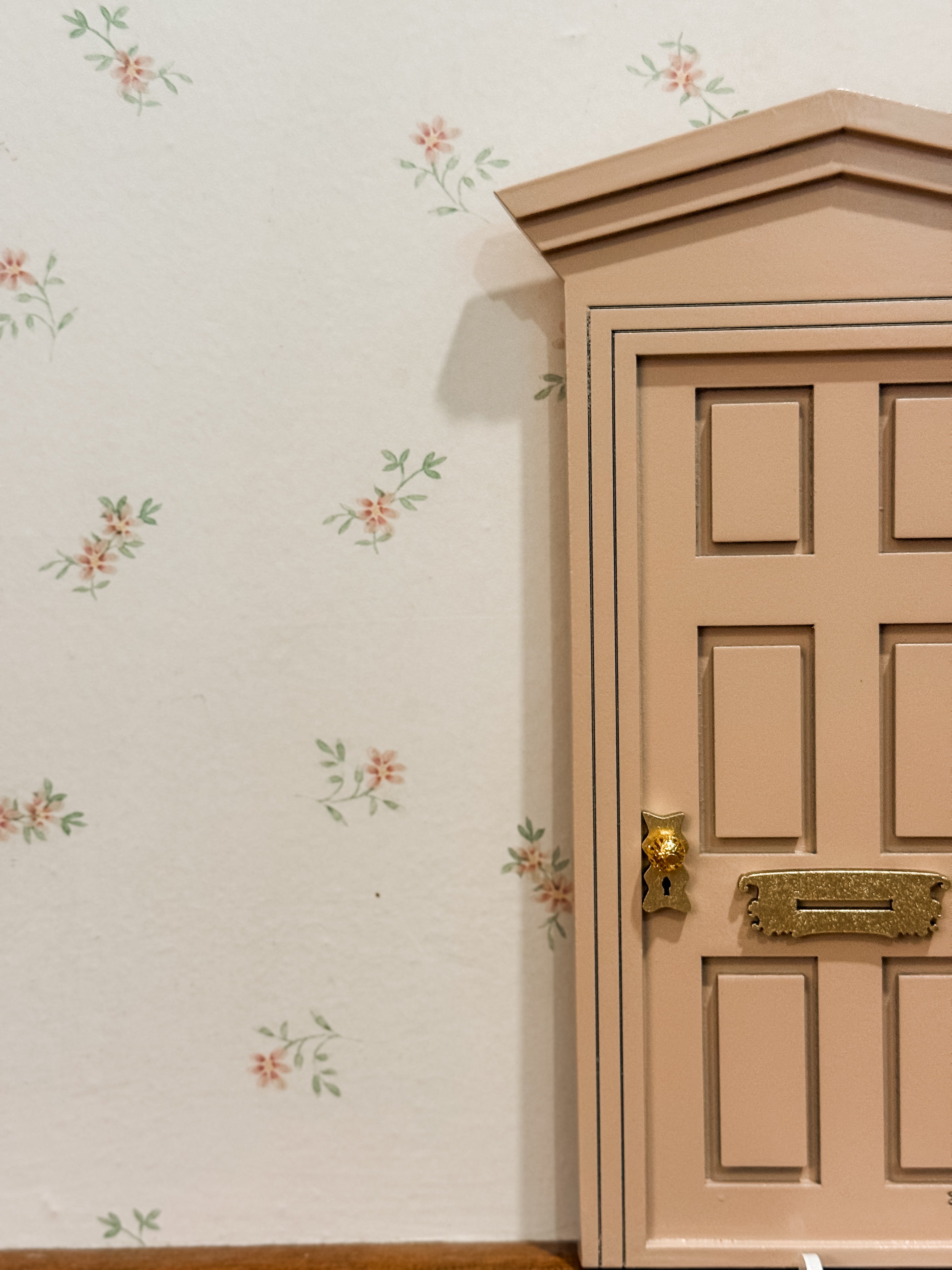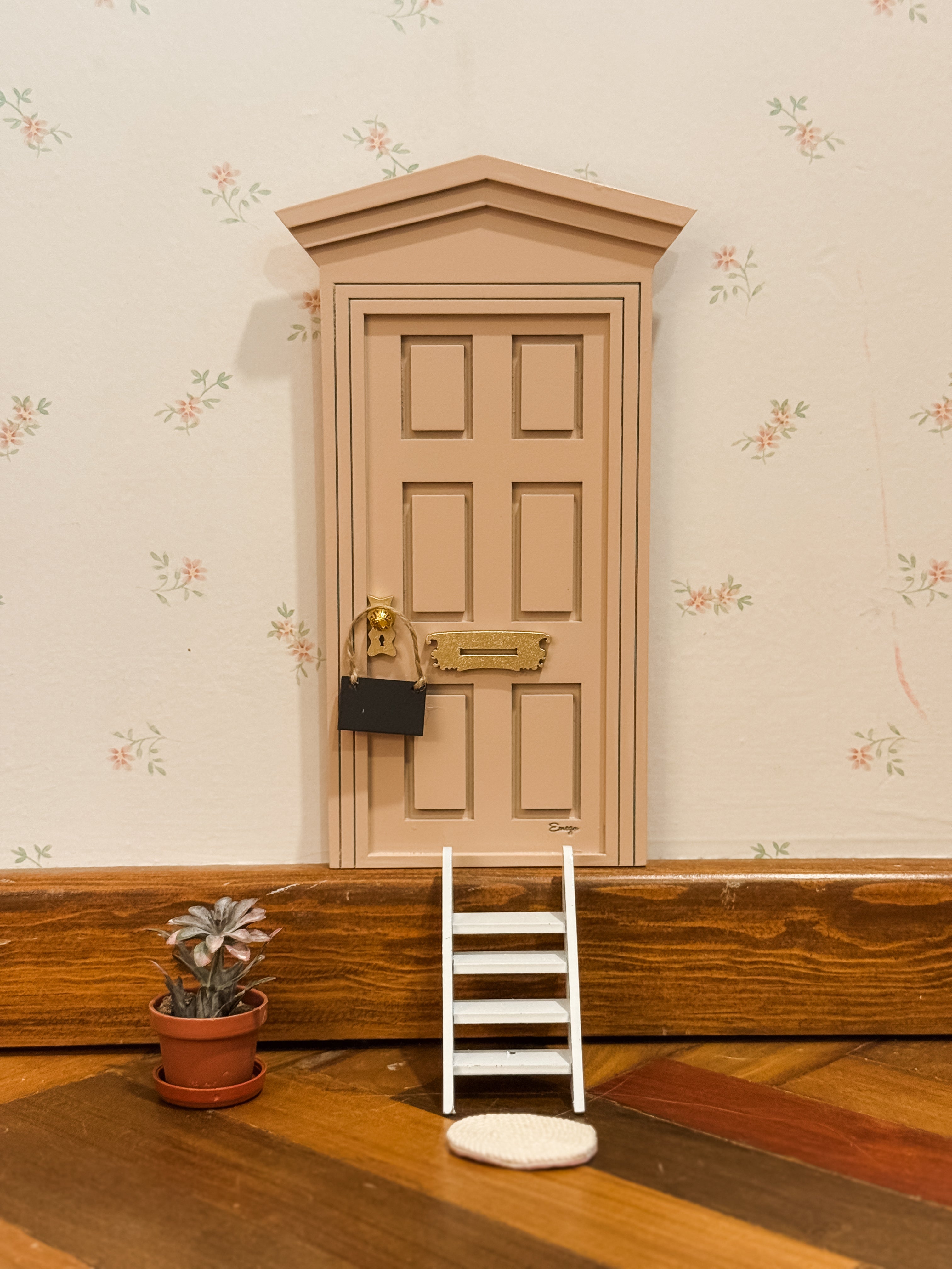 Encantadora puerta rosa en miniatura, diseñada para que el ratoncito pueda usarla para entrar y recoger el diente a cambio de una sorpresa.
