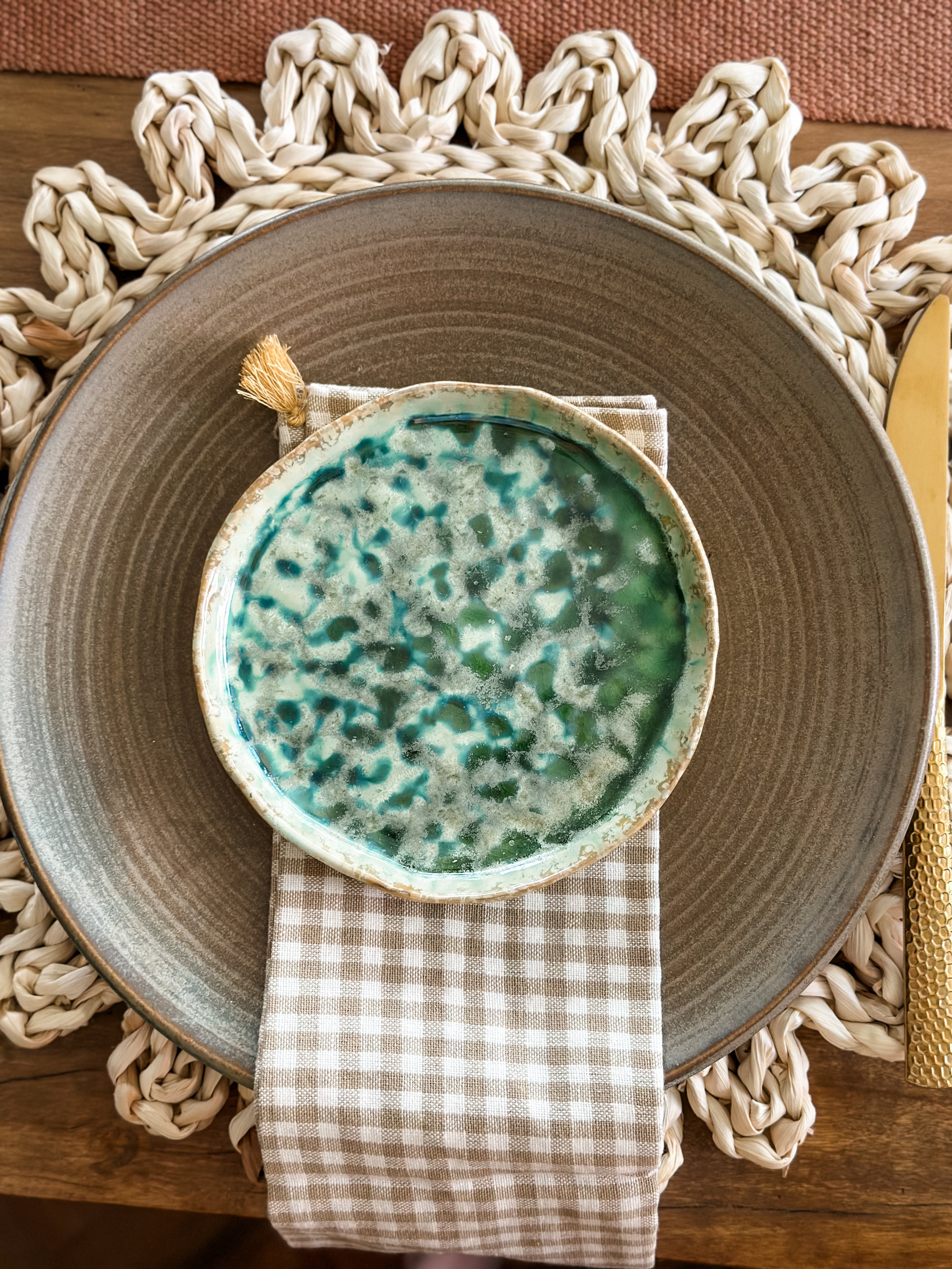 Plato chico verde con orilla. Sus medidas son 11.5 cm de diametro x 2 cm de altura.
