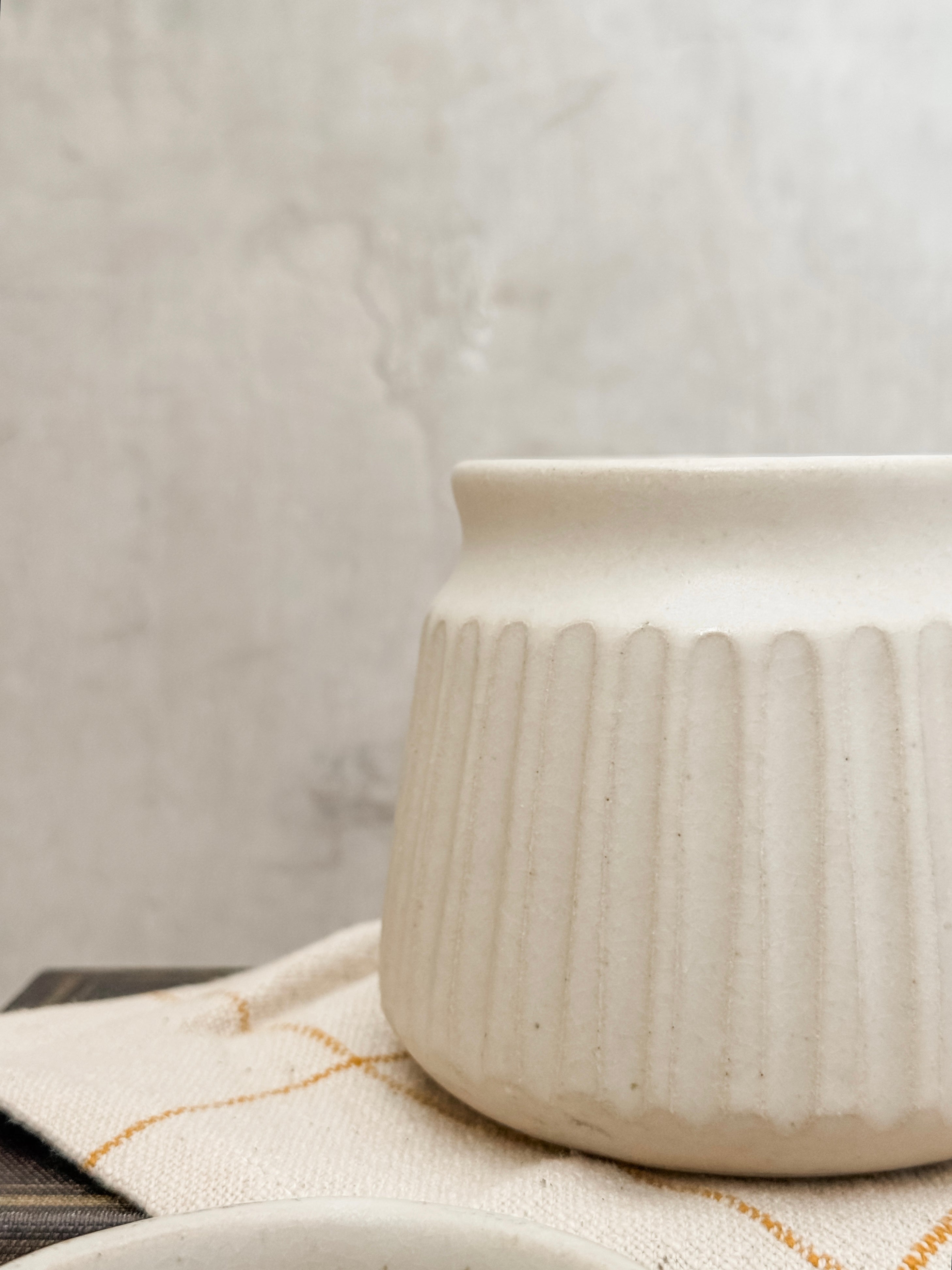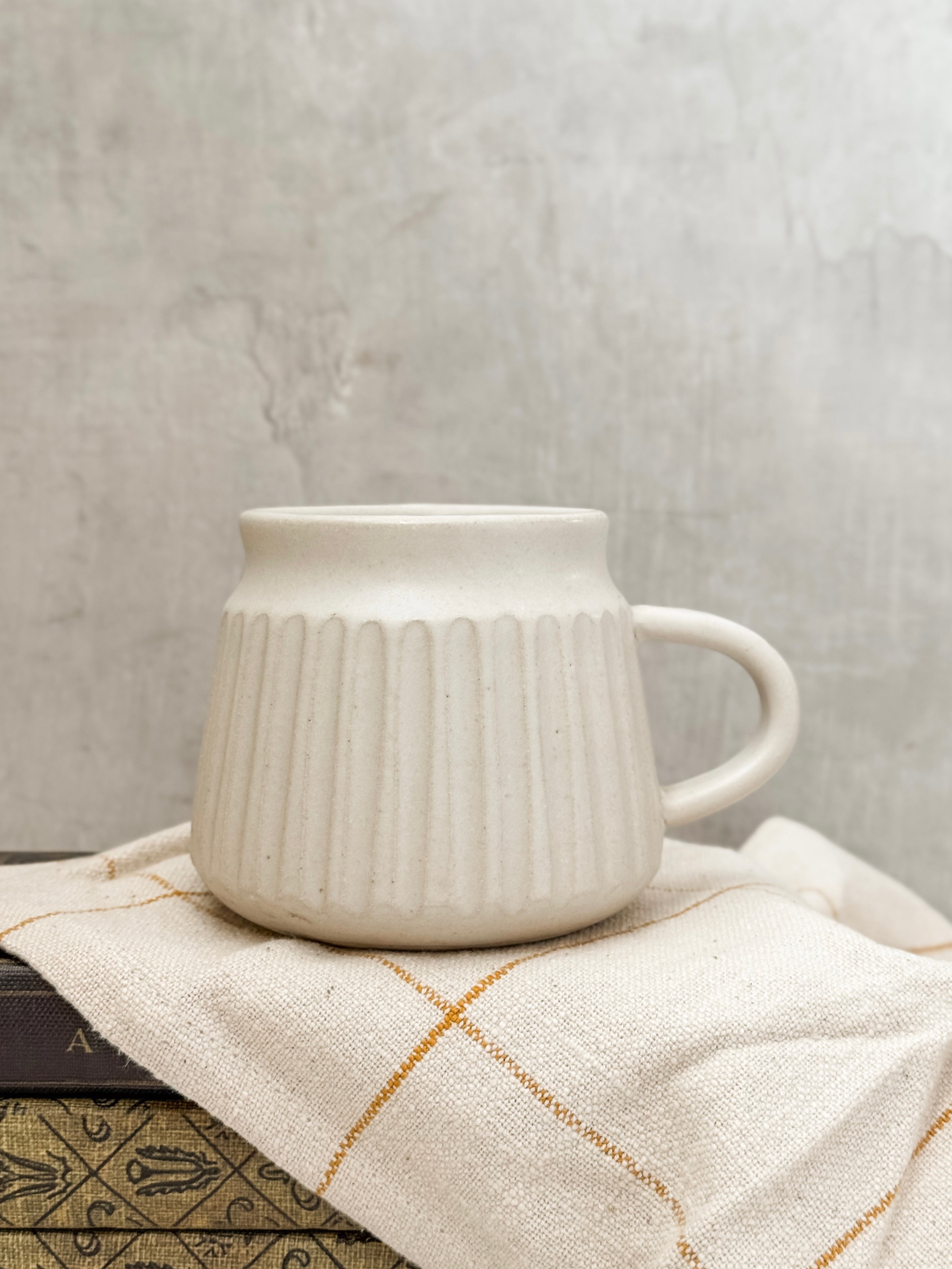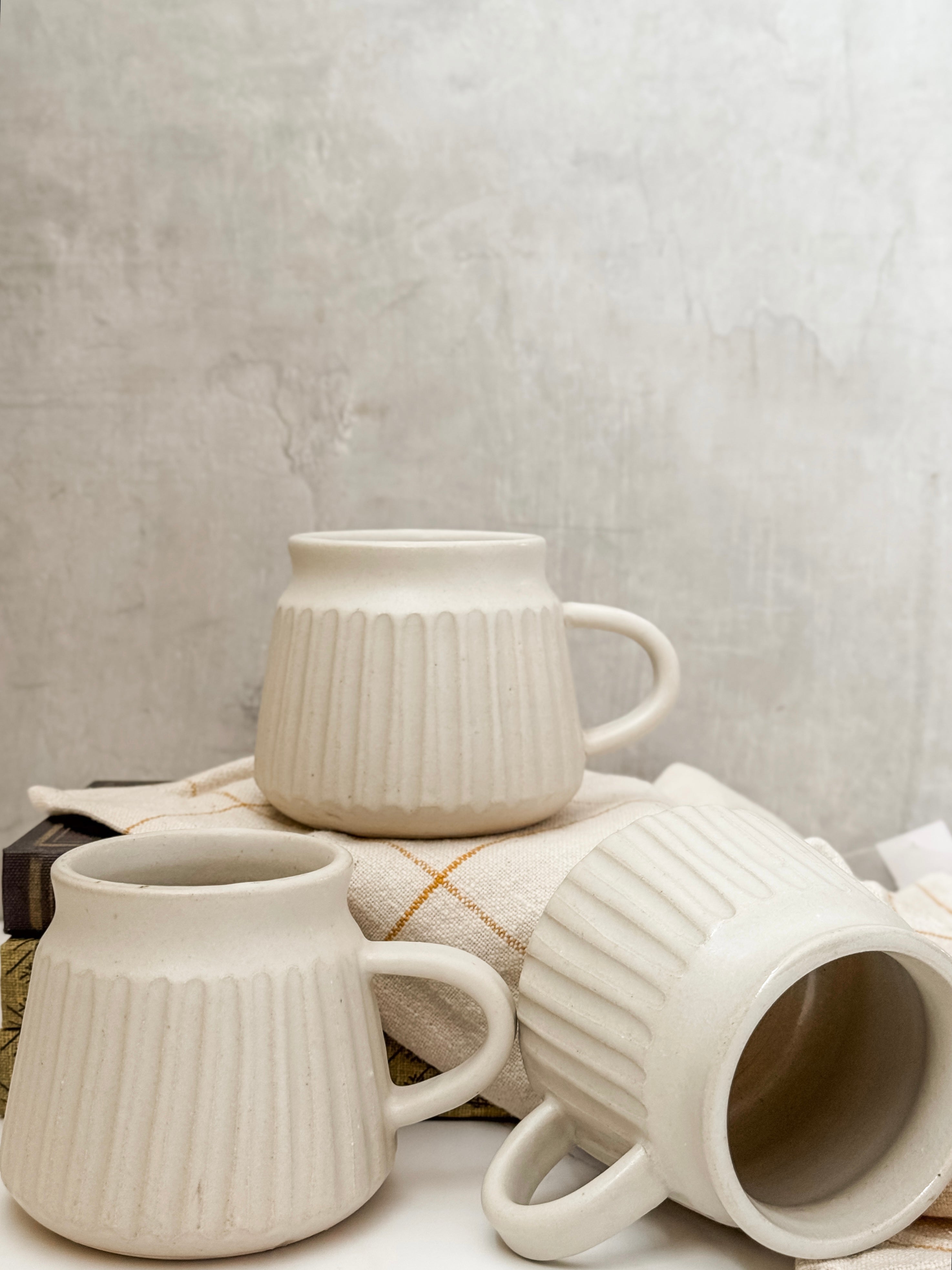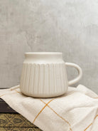 Taza de Cerámica Acanalada Blanca. Sus medidas son 10 cm x 9.5 cm de diametro, con capacidad de 16 oz.
