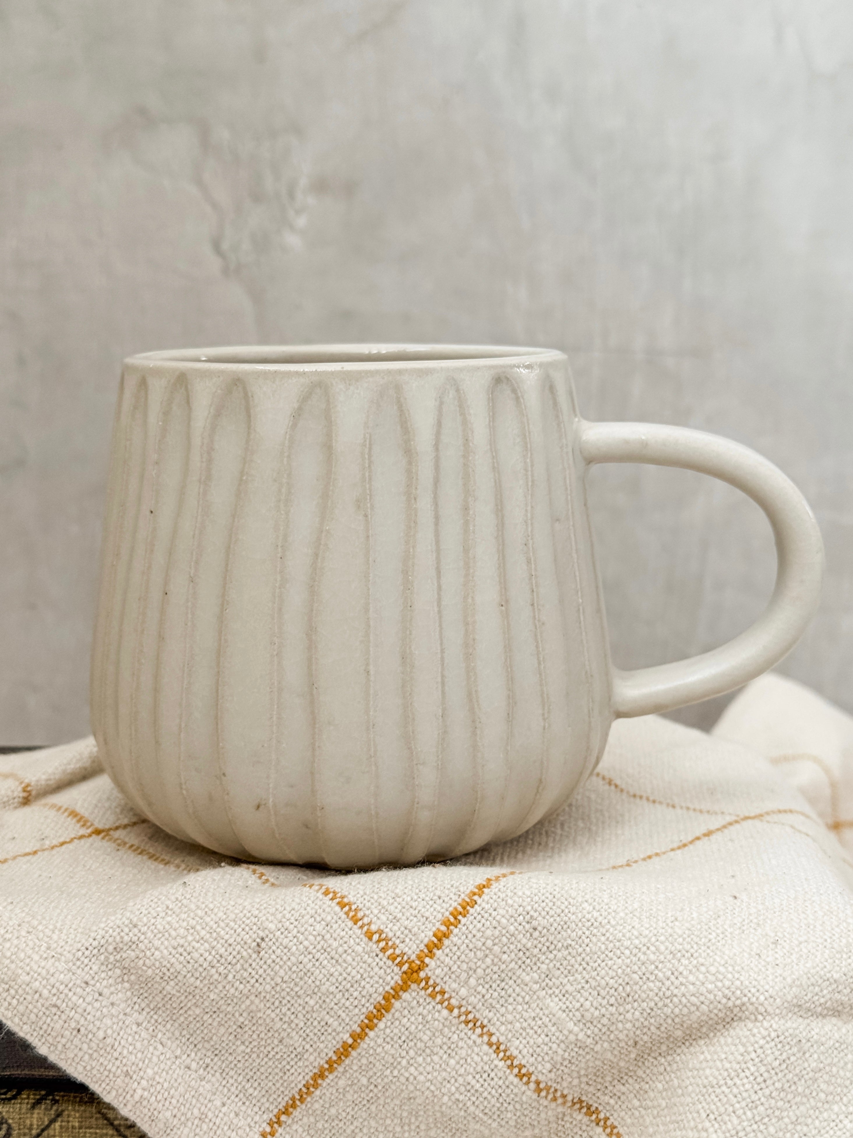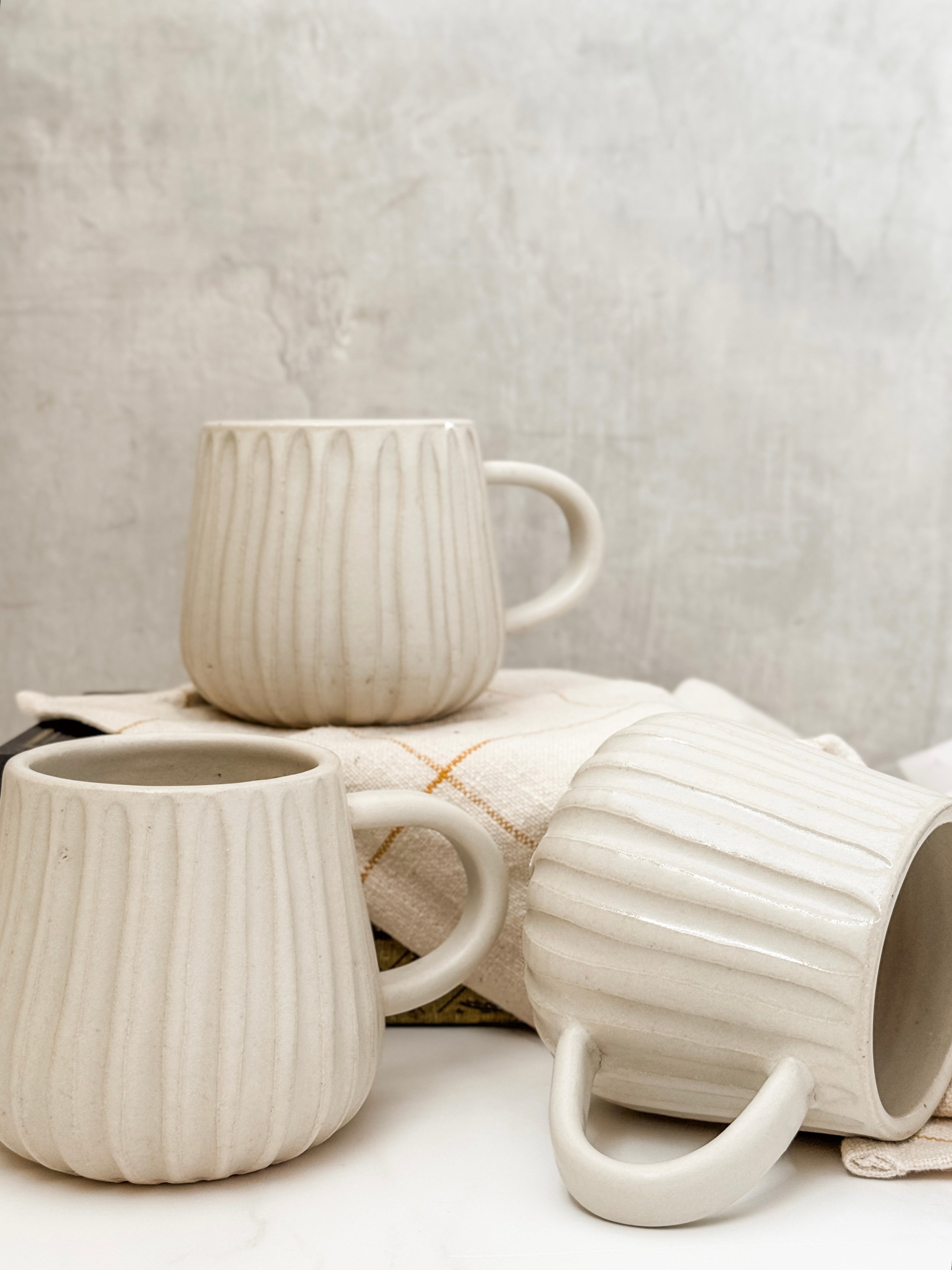 Taza de Cerámica Acanalada. Sus medidas son 9.5 cm alto x 9.5 cm de diametro, con capacidad de 16 oz.