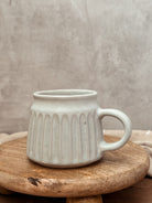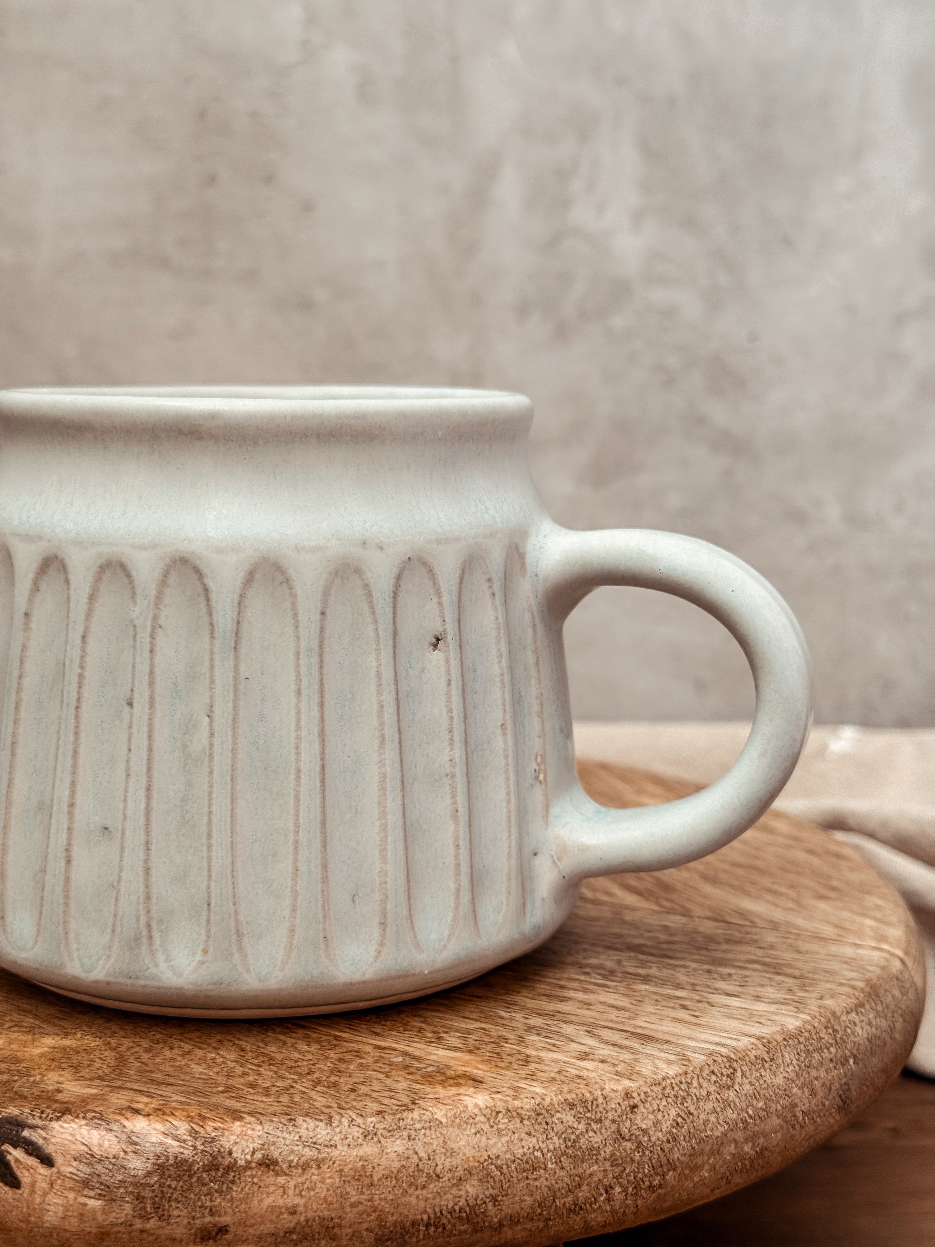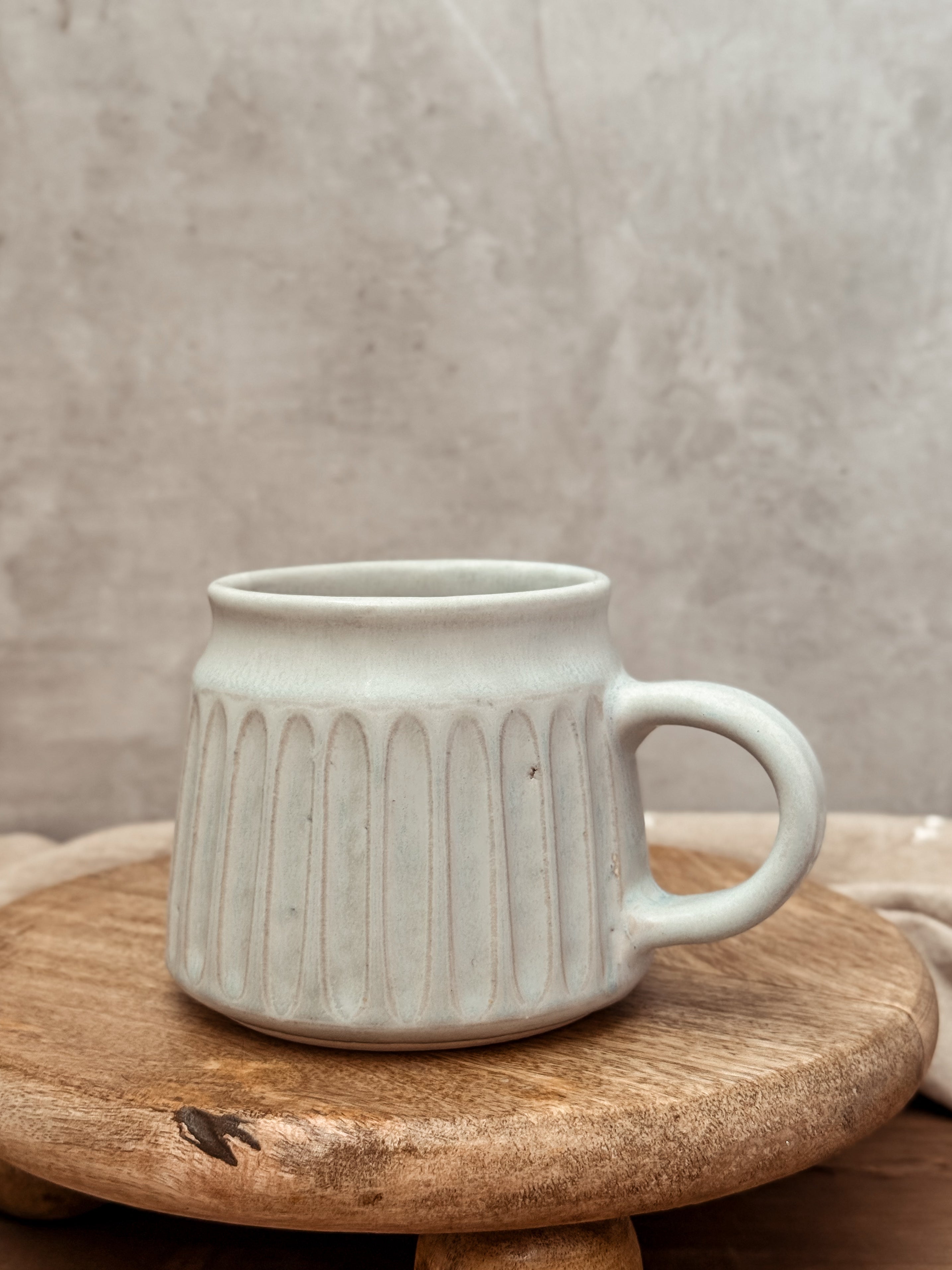 Taza de cerámica en un suave tono azul claro, con un diseño de relieve que aporta textura y estilo. Su forma robusta y asa cómoda la convierten en una opción ideal para disfrutar de tus bebidas favoritas.