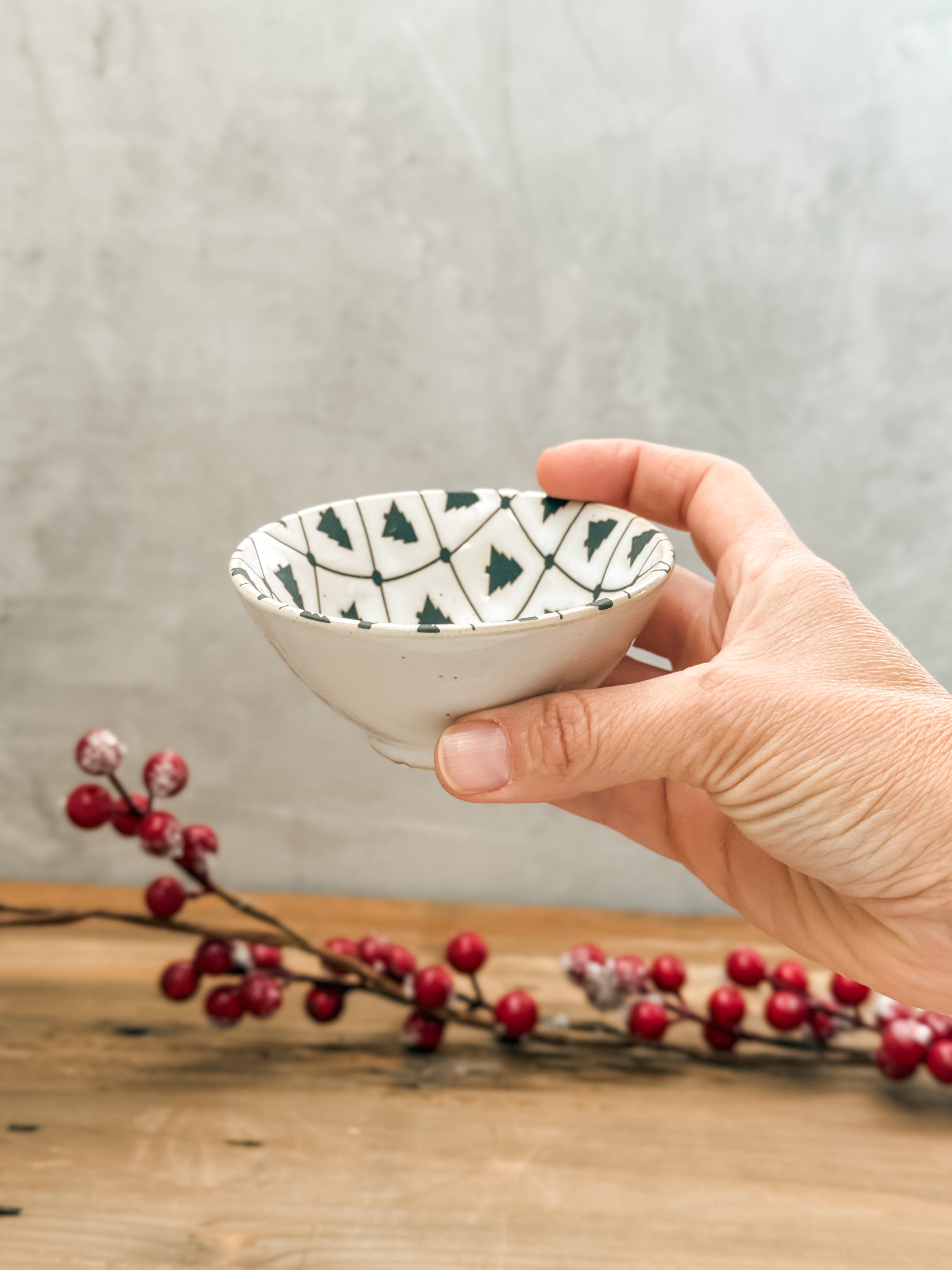 Tazón de cerámica mini con pequeños árboles de Navidad en tonos oscuros y fondo blanco. Su forma redonda lo hace ideal para servir aperitivos, dulces o como elemento decorativo.