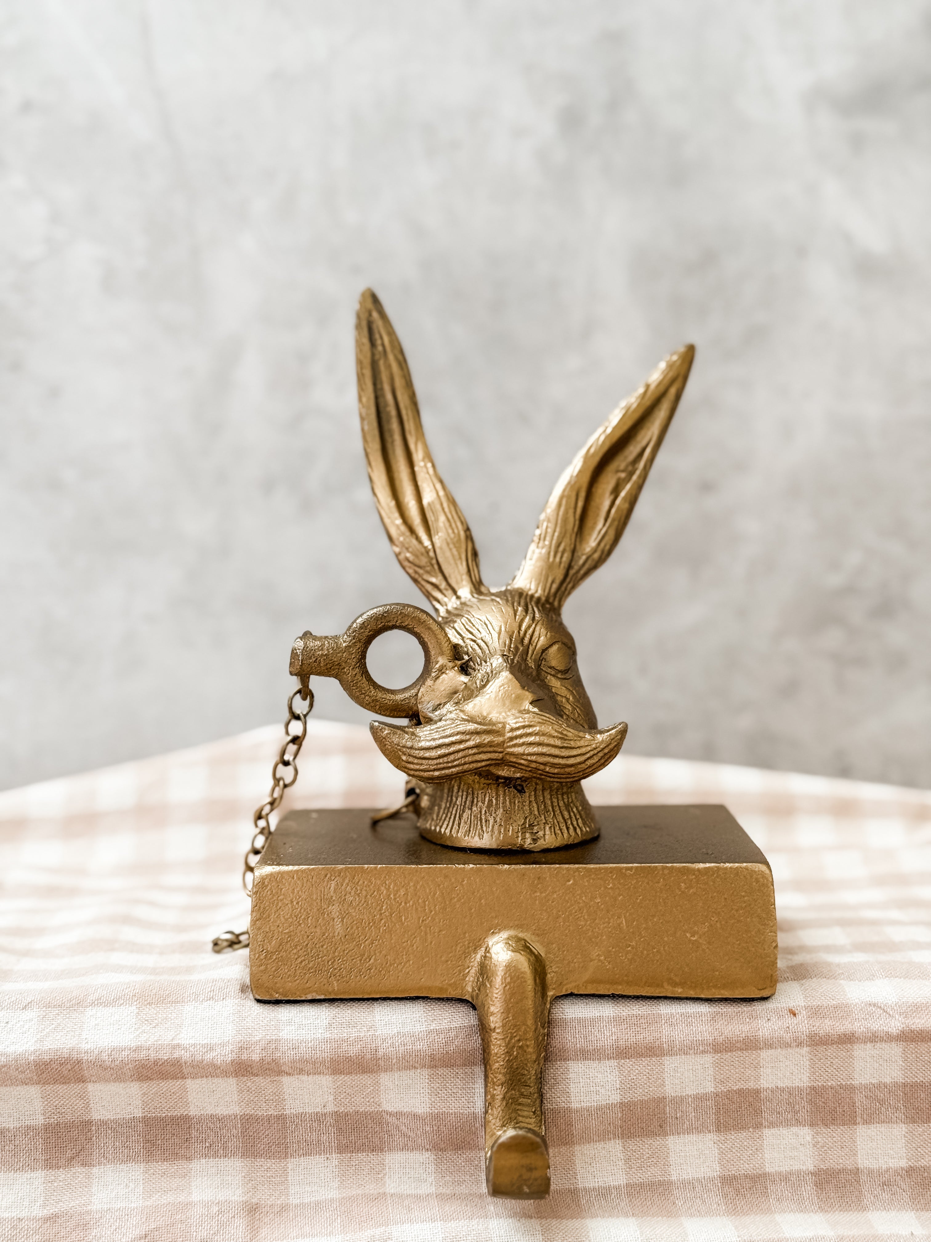 Portabota en forma de cabeza de conejo, decorado con gafa. Hecho de metal con un acabado en bronce, añade un toque divertido y elegante a cualquier estantería.