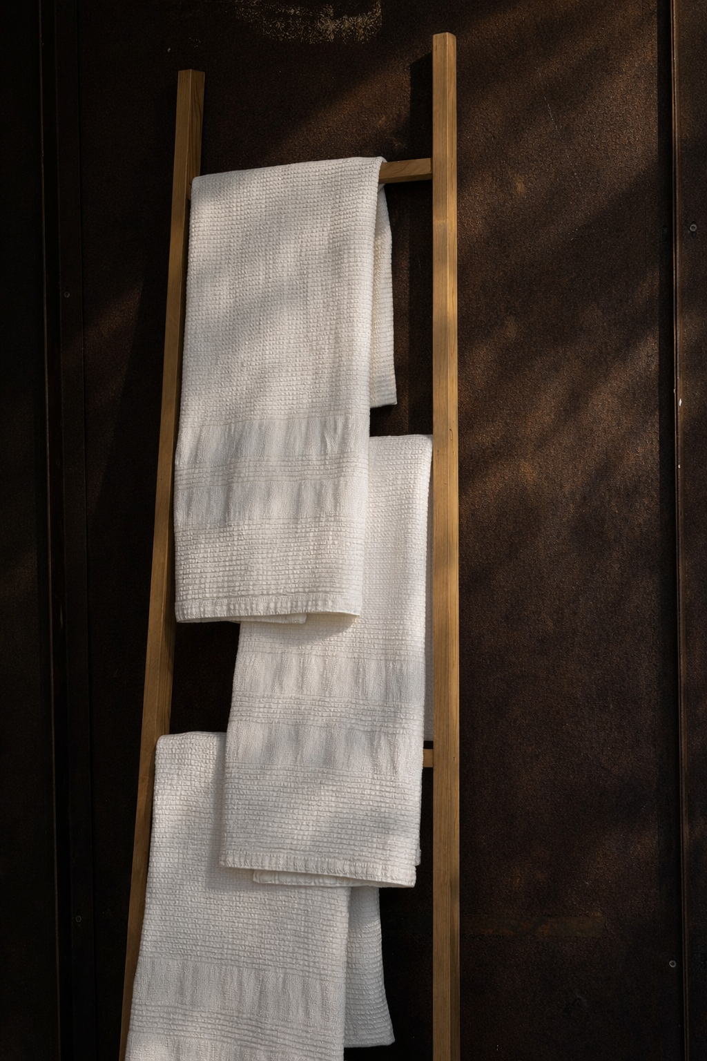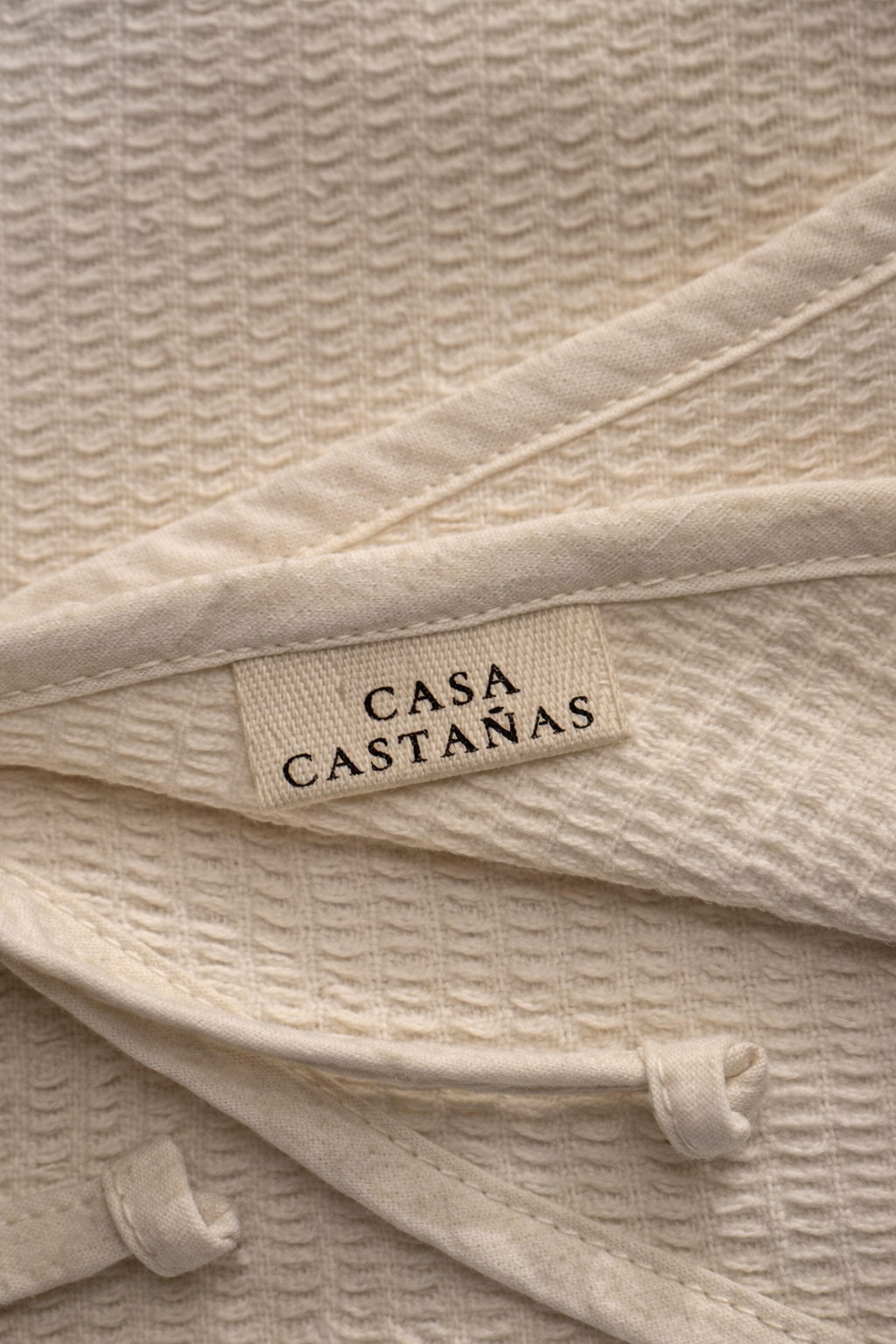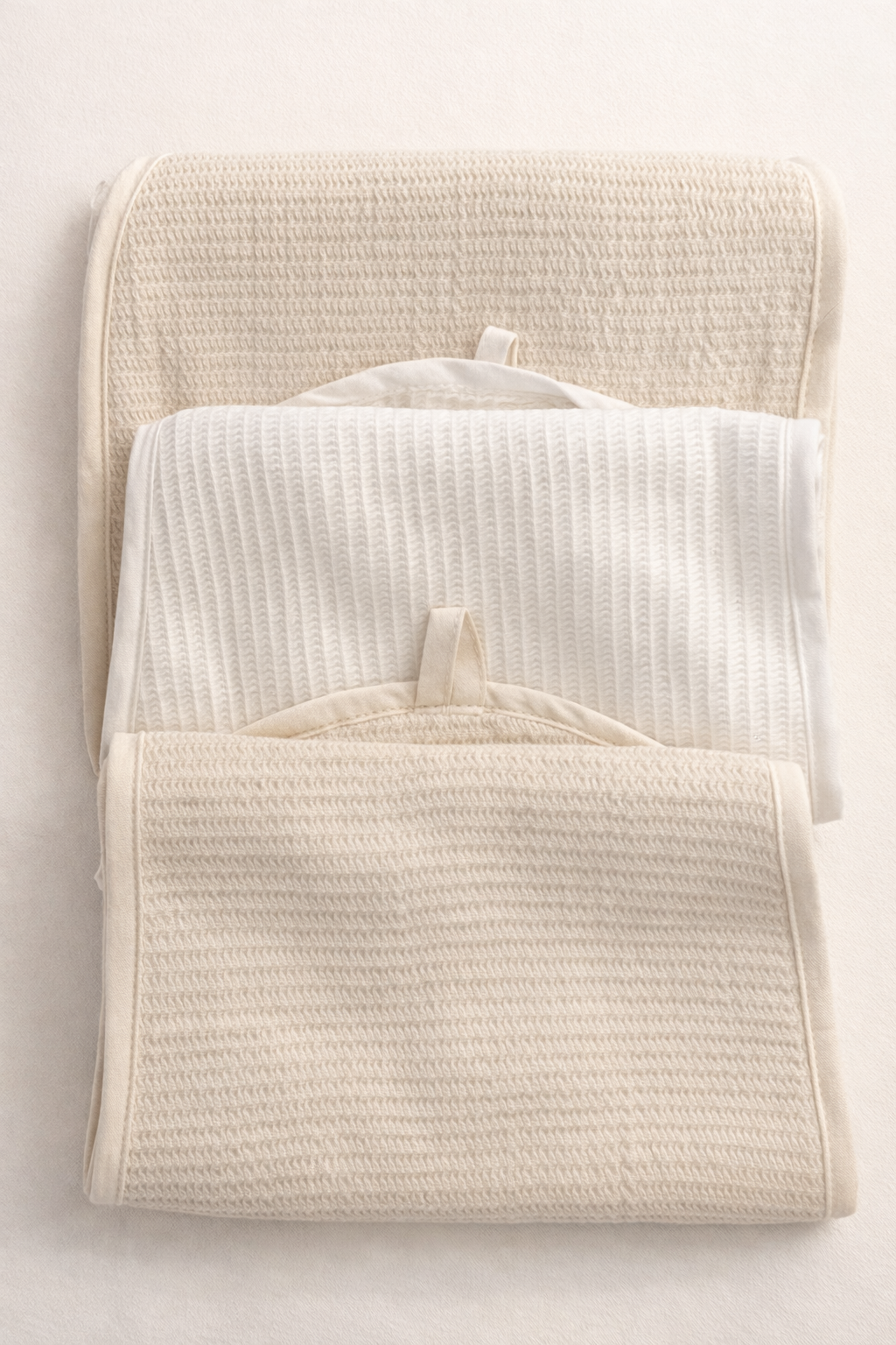 Toallas de cuidado personal elaborado con algodón orgánico. Toalla de cuerpo generosa de 165x170 cm, ideal para envolverte después de la ducha con máxima comodidad y absorción. Complementa tu rutina con el turbante para cabello que seca de forma suave y eficiente, y las bandas para cabello que lo mantienen sin dañarlo. Todos los productos están confeccionados con fibras naturales que respetan tu piel y el medio ambiente.