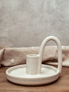 Portavelas de cerámica con diseño minimalista y asa curva. Su acabado en tonos neutros lo convierte en un elegante elemento decorativo para cualquier espacio. Ideal para crear un ambiente acogedor.