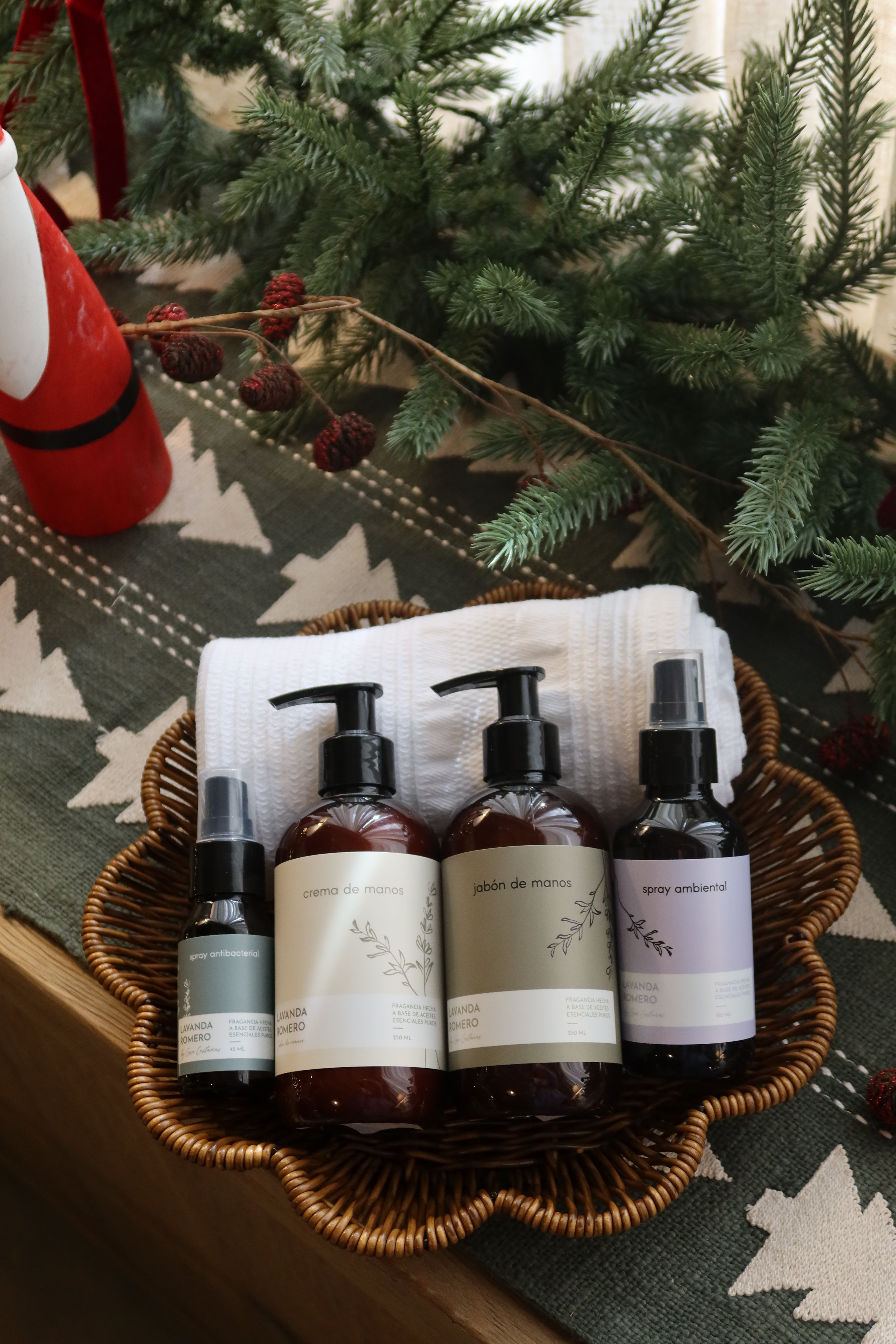 Vive la magia de las festividades con esta canasta navideña que reúne lo mejor en cuidado y aroma. Descubre la armonía de lavanda y romero en cinco productos seleccionados: jabón de manos (250 ml), crema para manos (250 ml), spray ambiental (120 ml), spray antibacterial (45 ml) y toalla de manos de algodón orgánico. Cada artículo está pensado para brindarte momentos de calma y renovación durante estas fechas especiales. Un regalo generoso que combina bienestar personal con la calidez que caracteriza la temporada navideña.