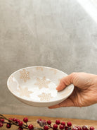Plato de cerámica blanco, presenta un elegante diseño de copos de nieve rositas. Ideal para servir aperitivos o como decoración.