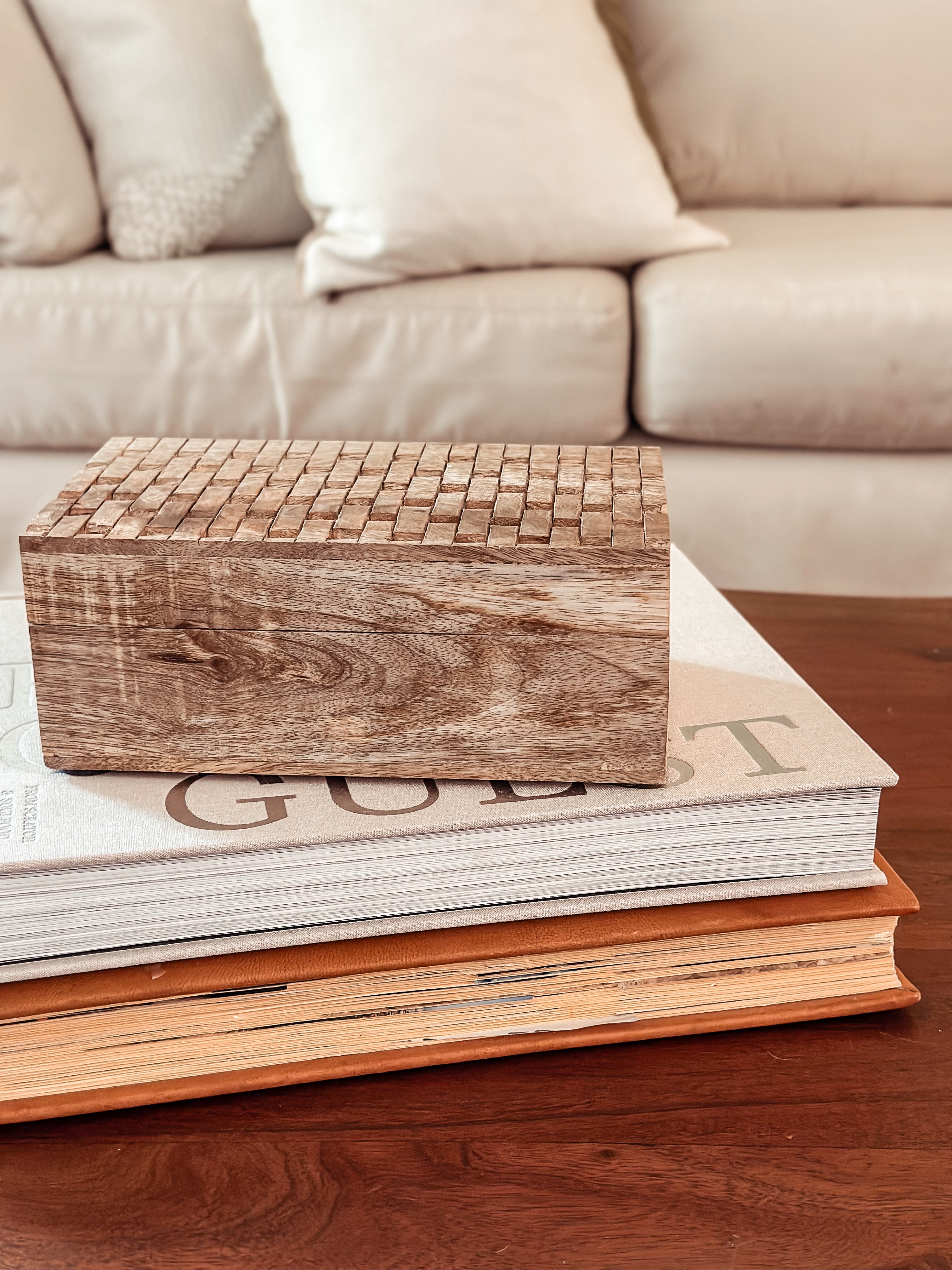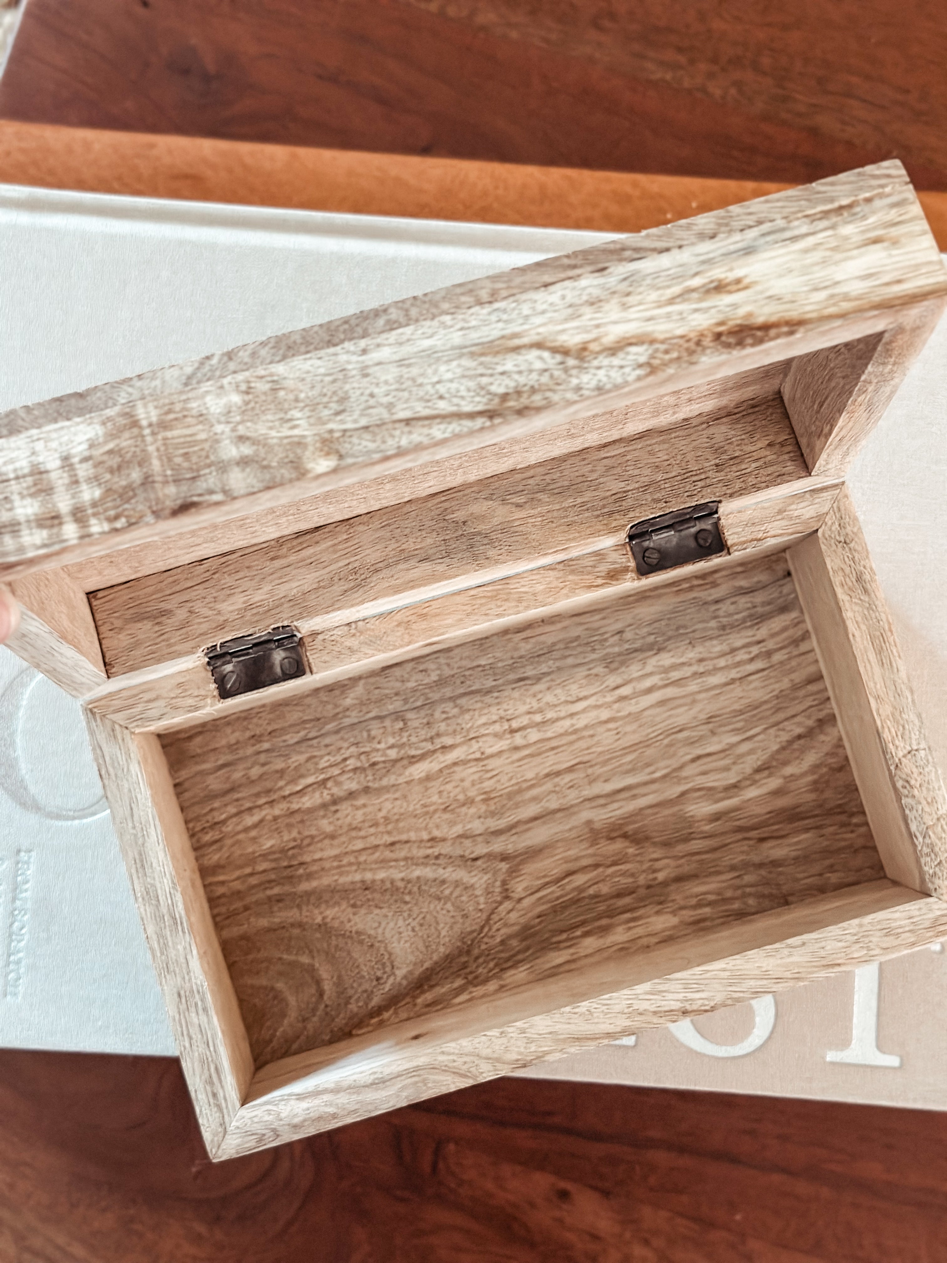 Caja de Madera, perfecta para guardar controles, llaves, o simplemente para decorar, sus medidas son 21 cm de ancho x 8 cm de alto.