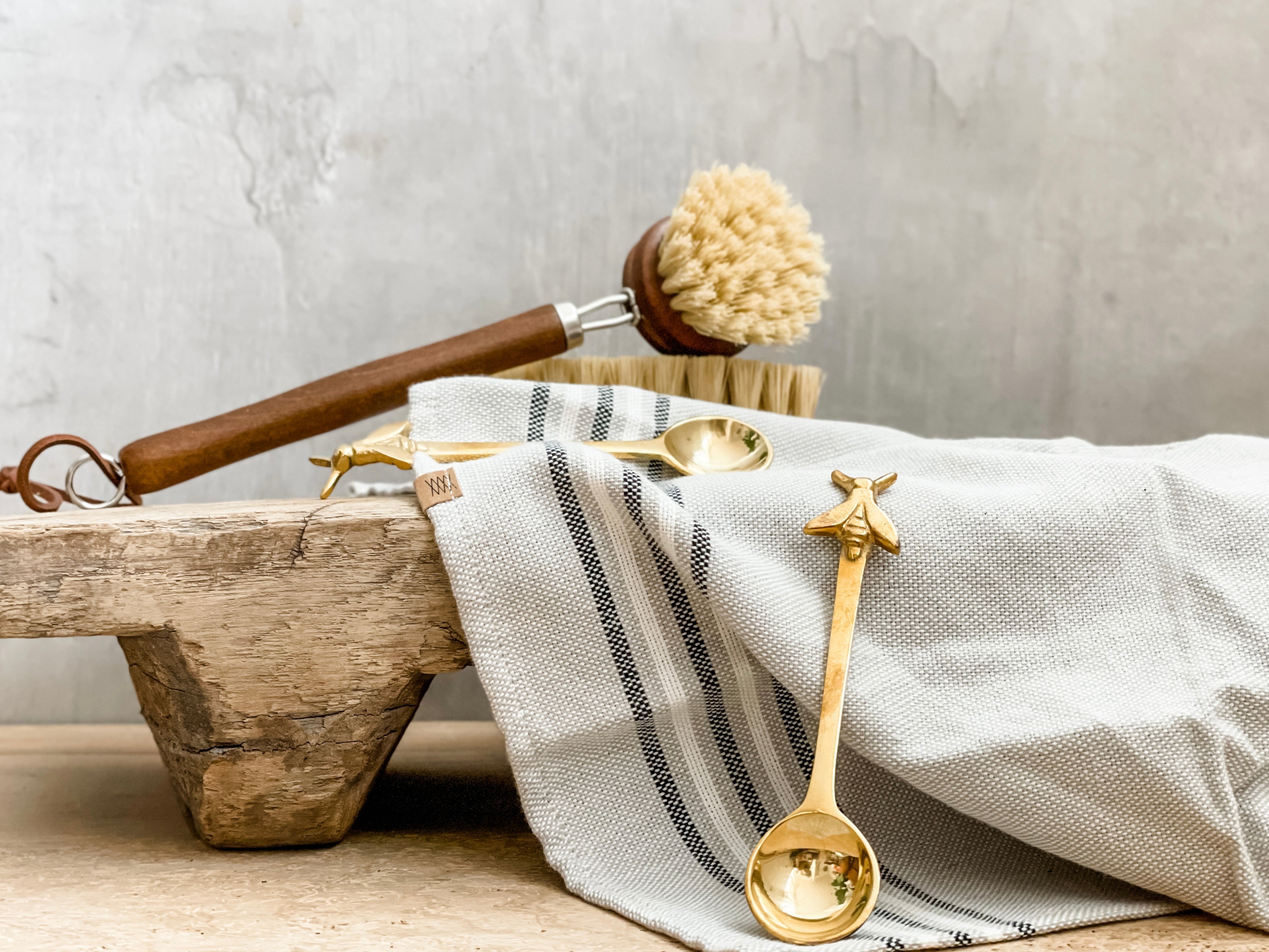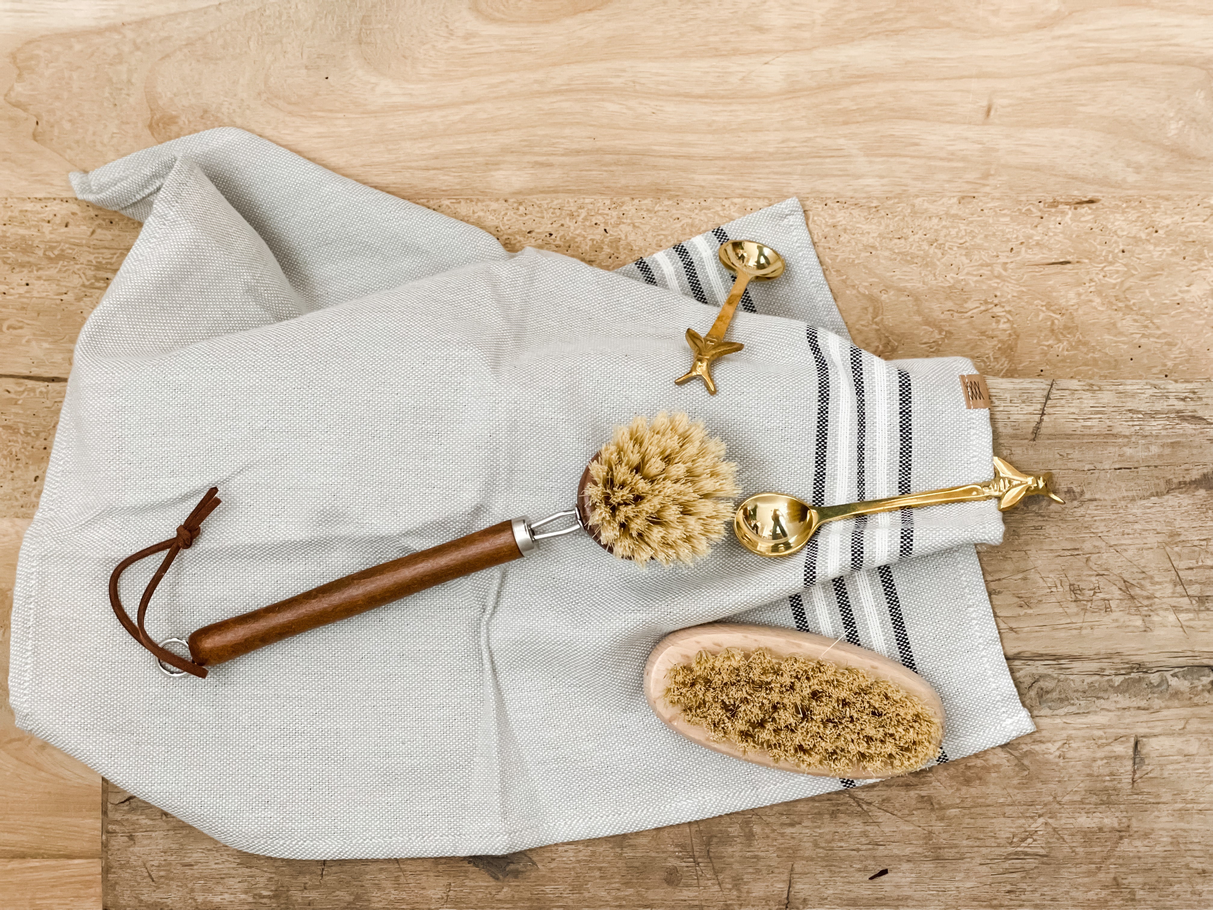Cepillo de Madera para platos con difícil acceso de tallar, y correa de piel, la cuál facilita el lugar donde colgar.