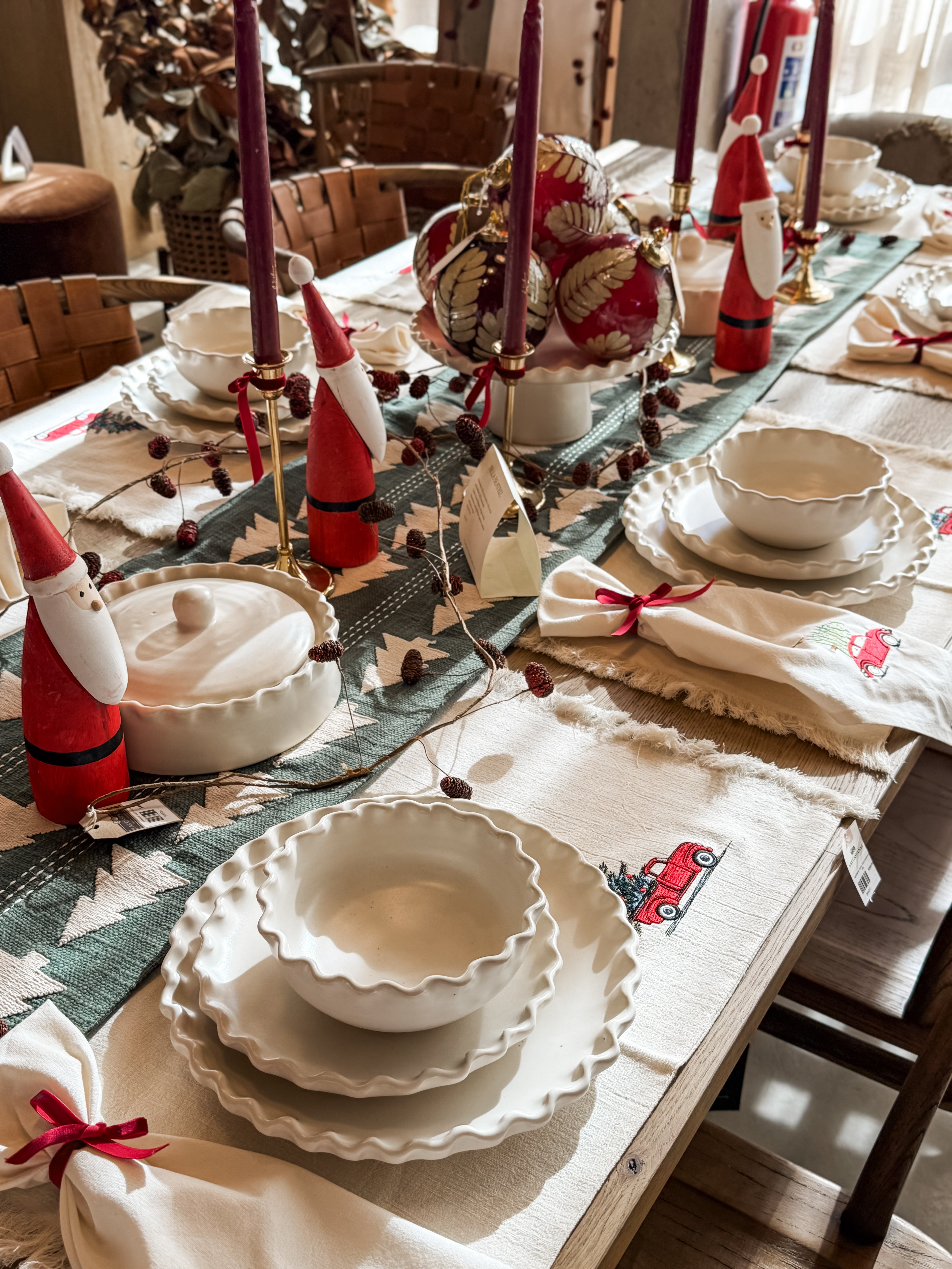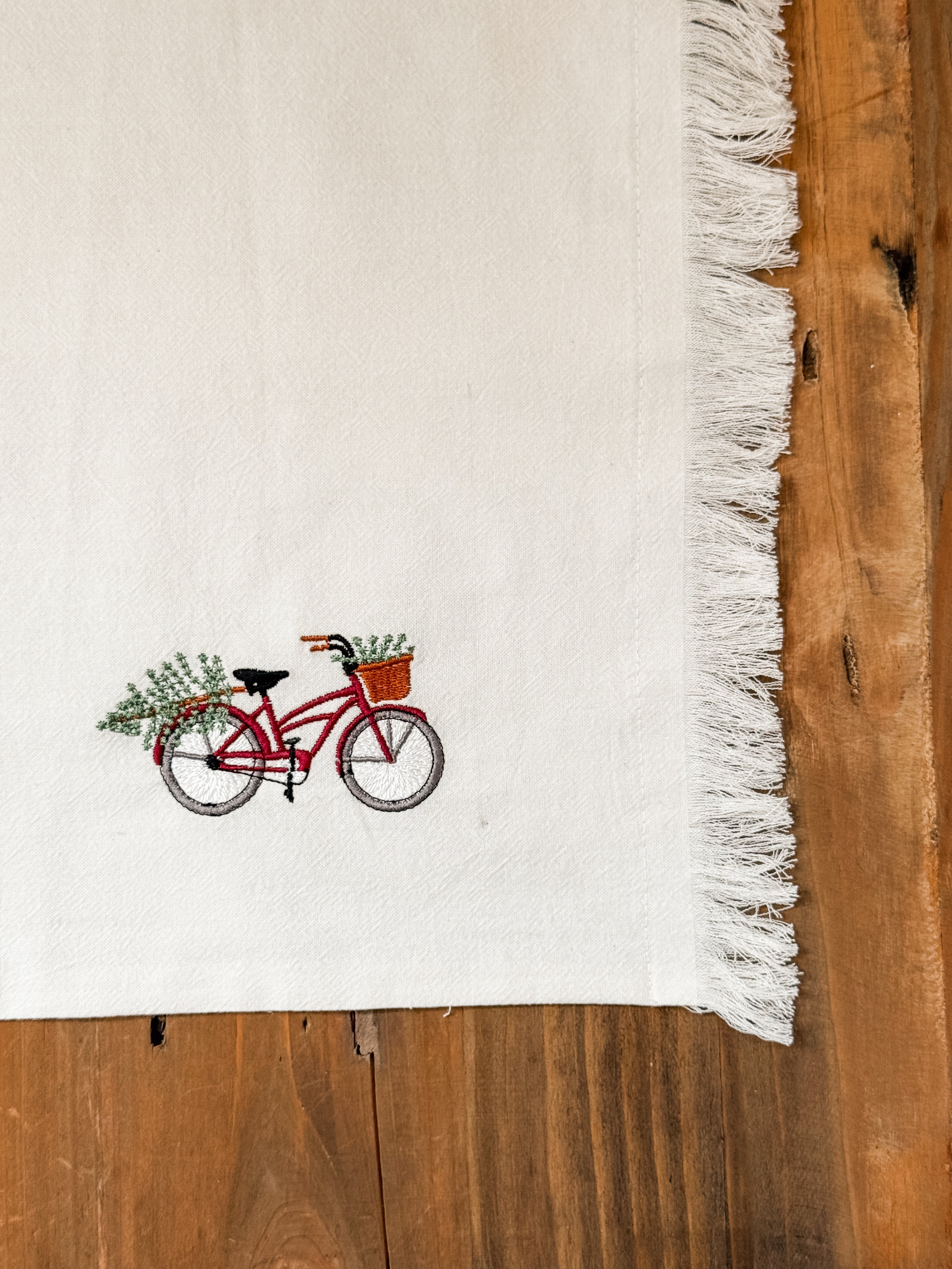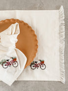 Individual blanco con bordado de bicicleta roja. Presenta un diseño simple y encantador, complementado con flecos en los extremos. Perfecto para añadir un toque fresco y acogedor a cualquier mesa.