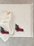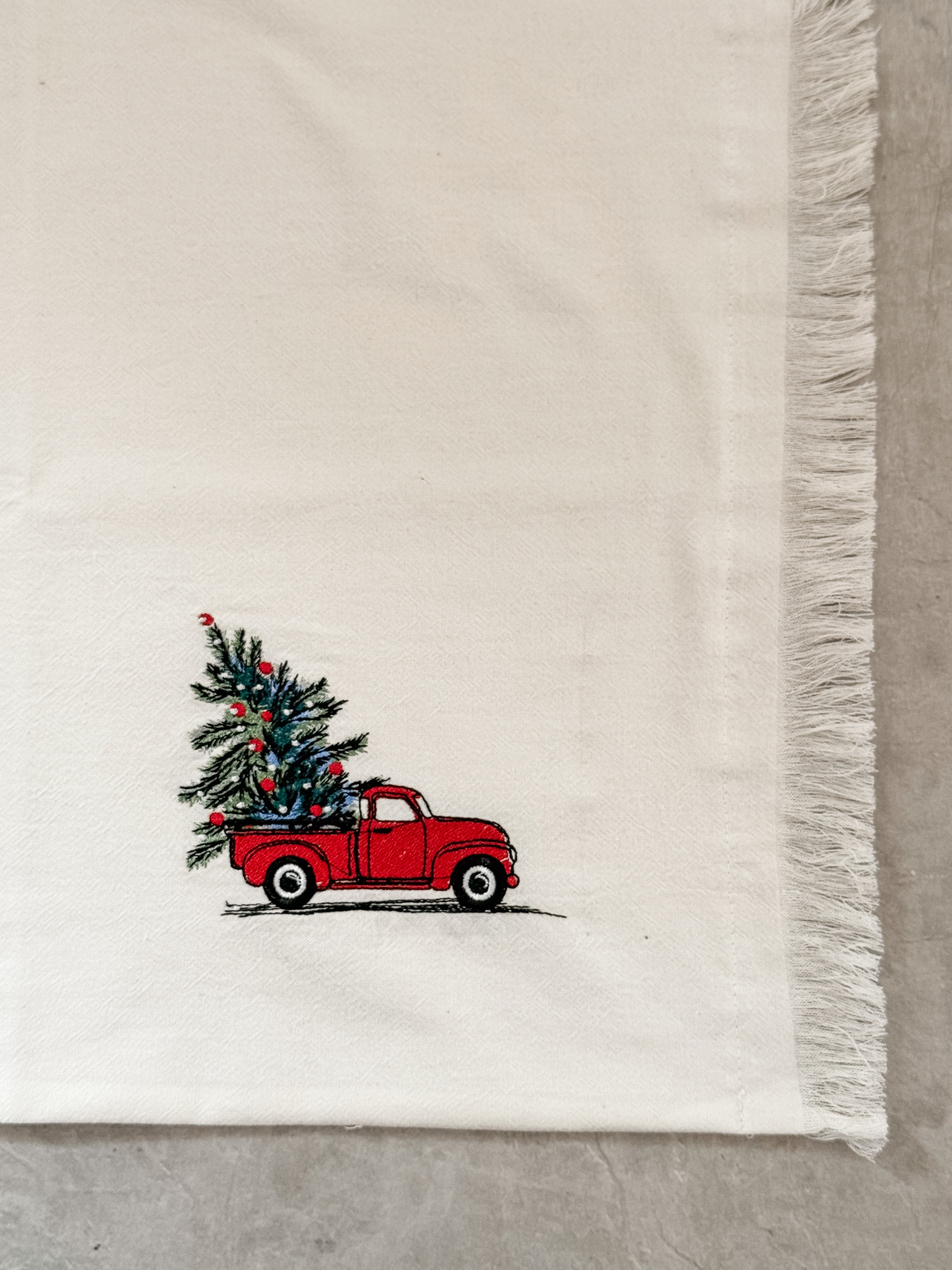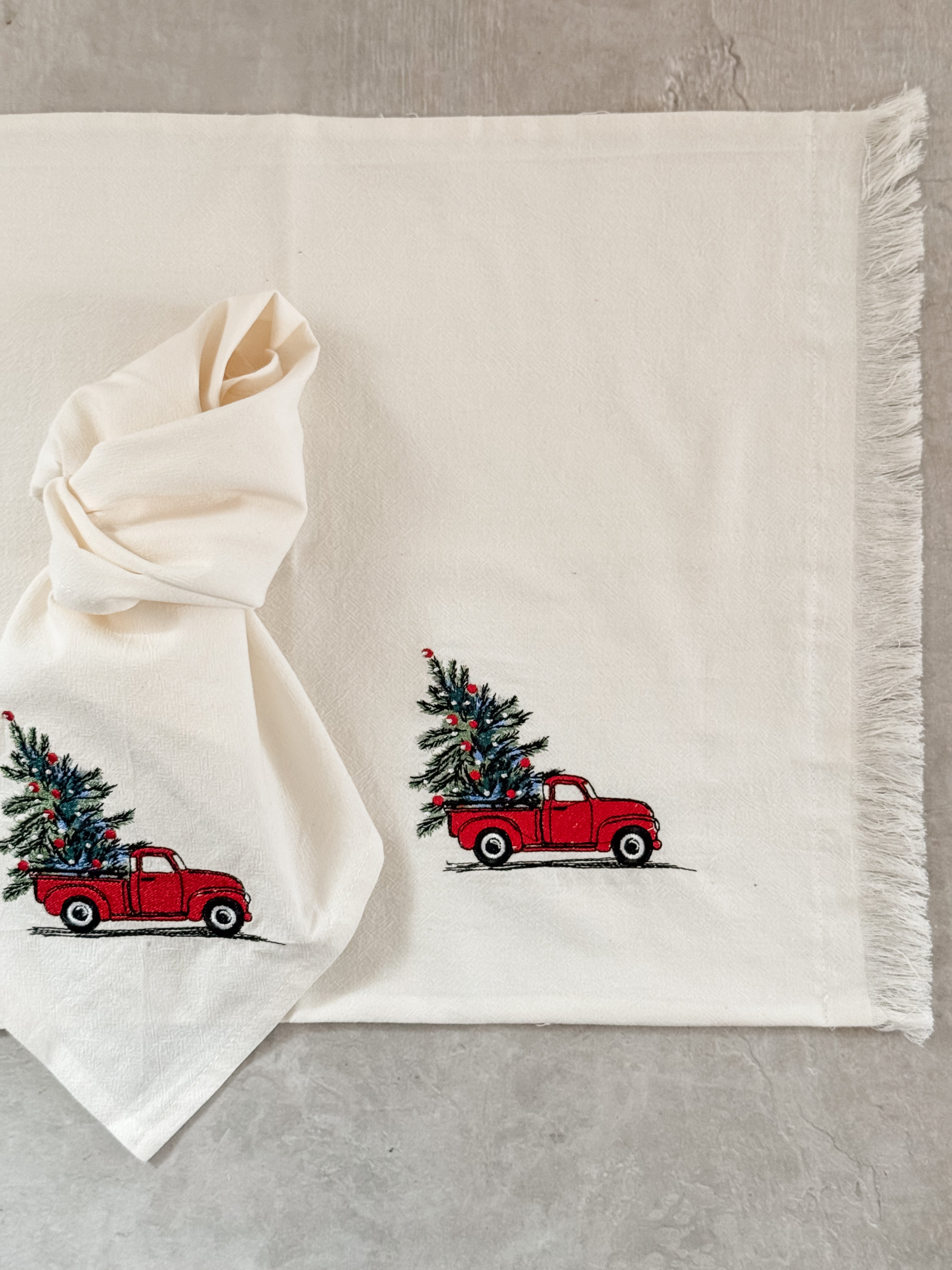 Individual blanco con bordado de una camioneta. Presenta un diseño simple y encantador, complementado con flecos en los extremos. Perfecto para añadir un toque fresco y acogedor a cualquier mesa.