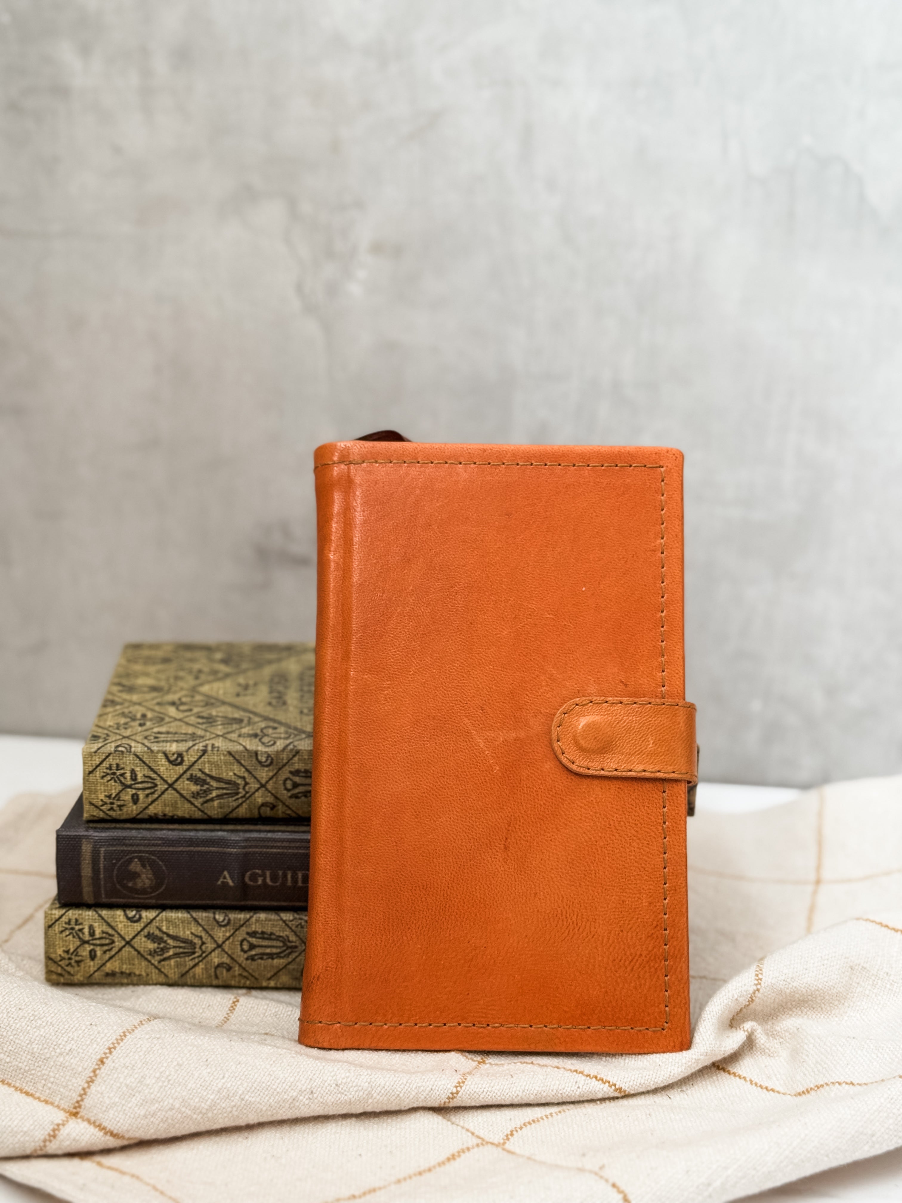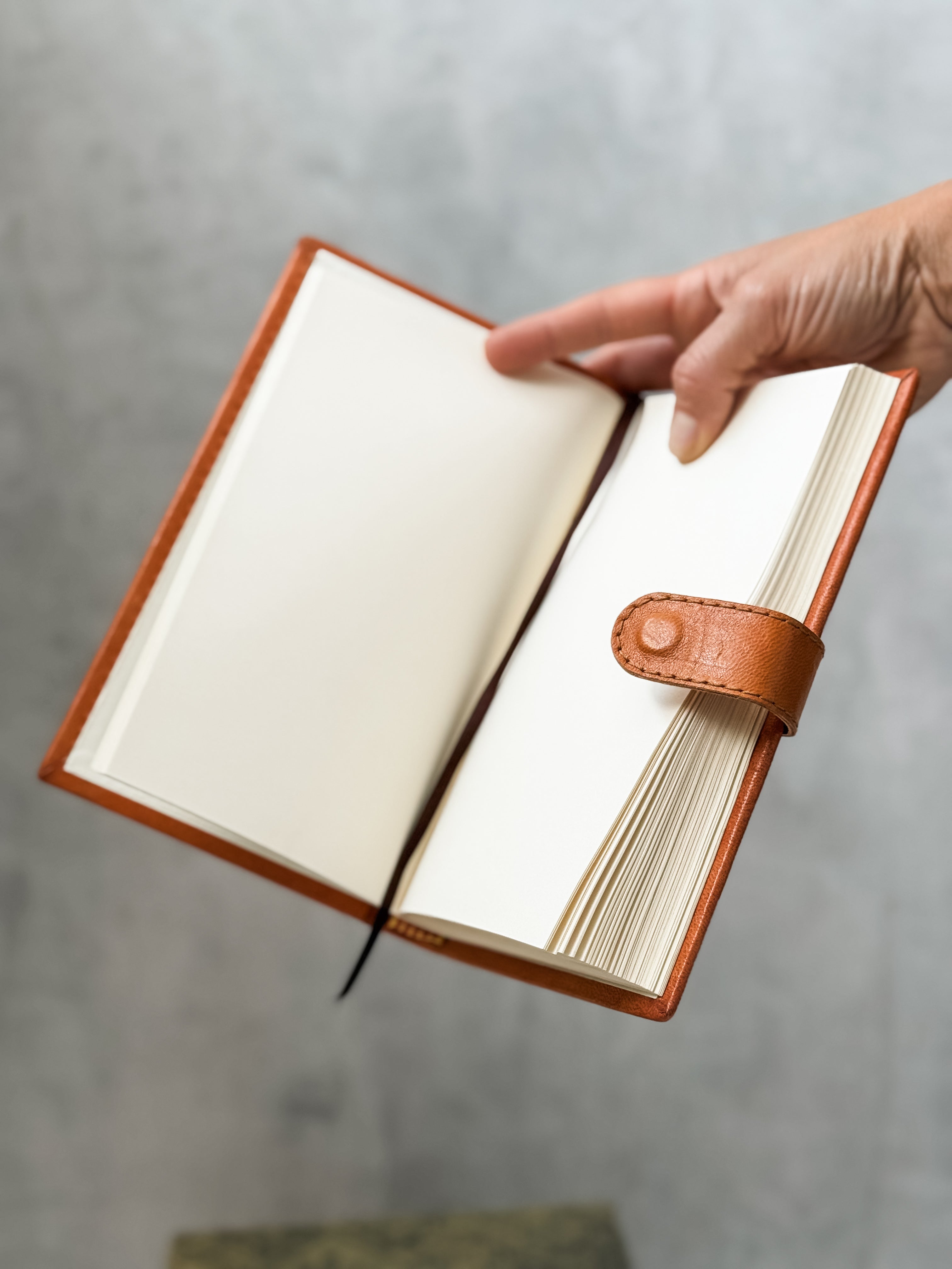 Libreta de Imán mediana, su pasta es de piel, sus hojas blancas, perfecta para hacer cualquier anotación y llevarla contigo. Sus medidas son 13 cm de ancho x 20 cm de alto.