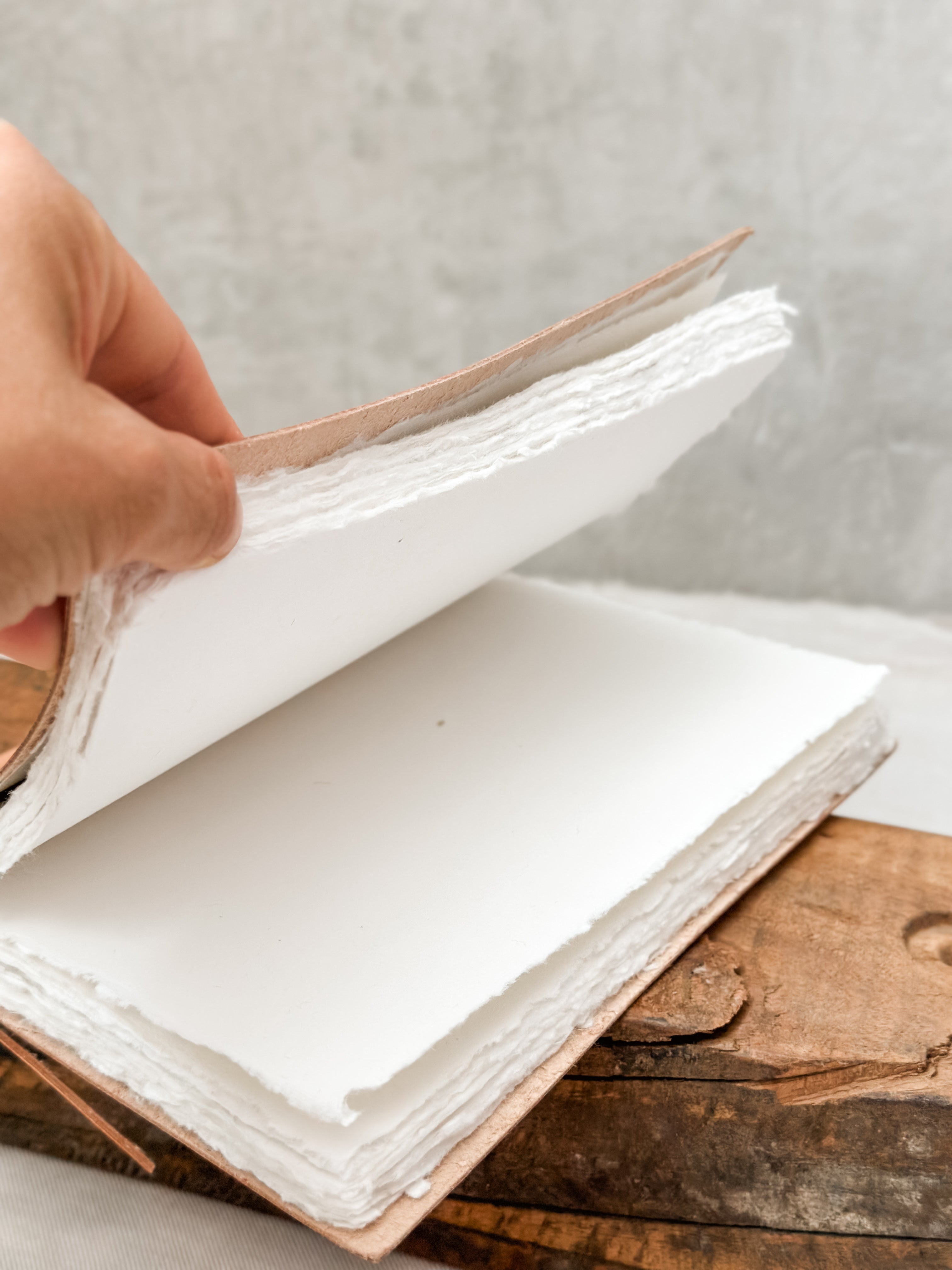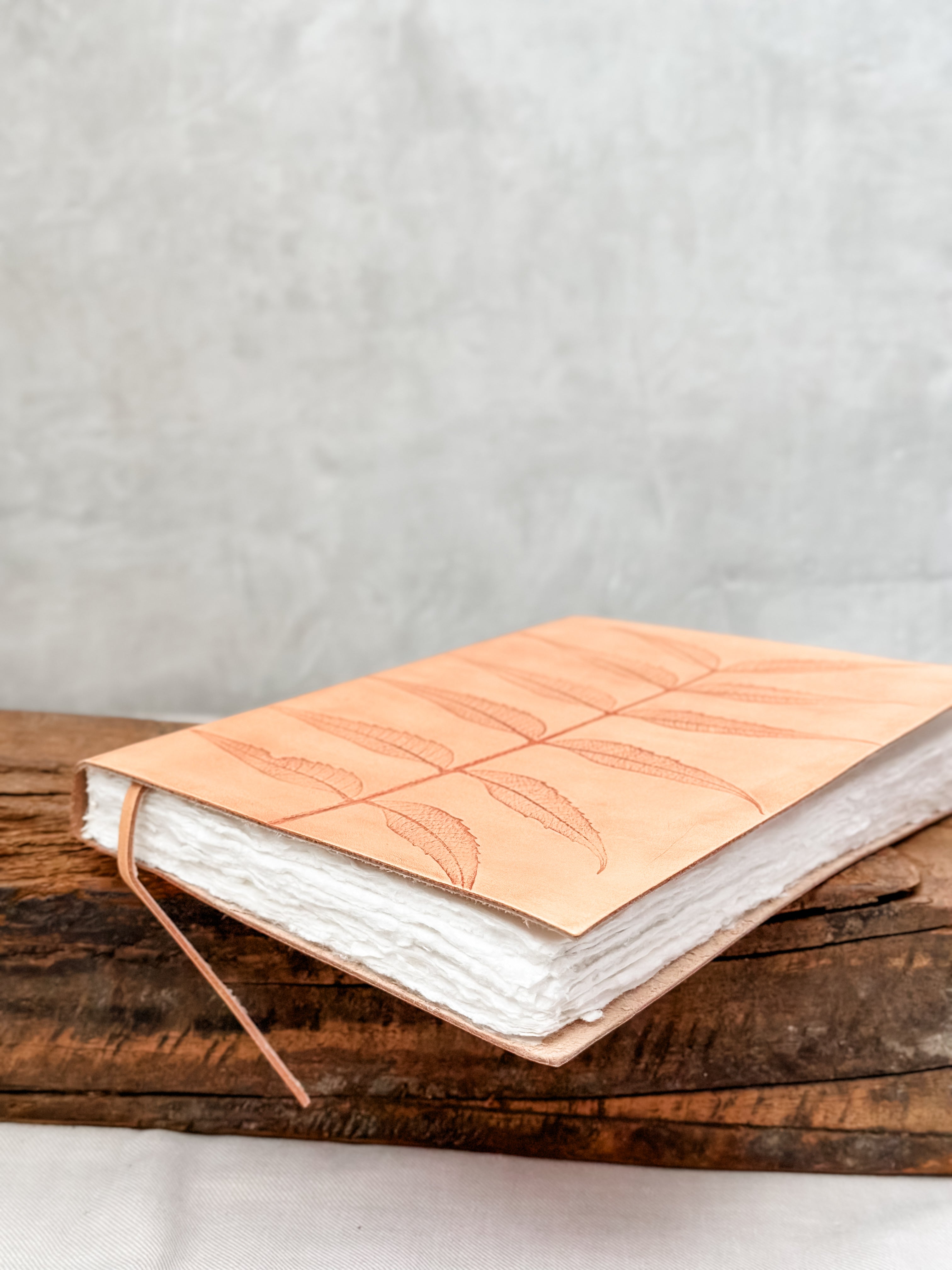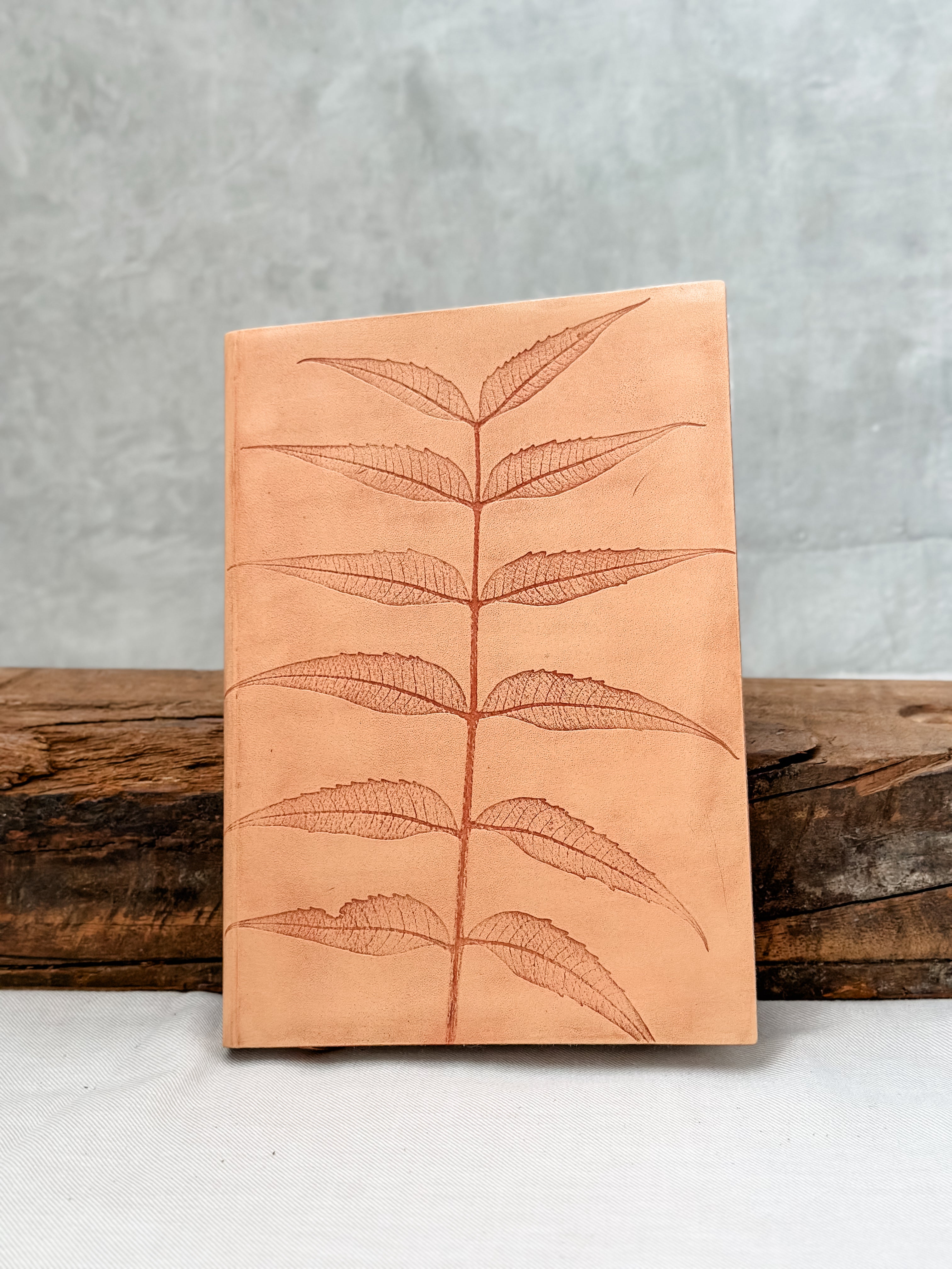 Libreta con hojas de tipo algodón, con pastas de piel y un lindo toque en su portada de hojas 20 cm de altura x 15 cm de ancho.