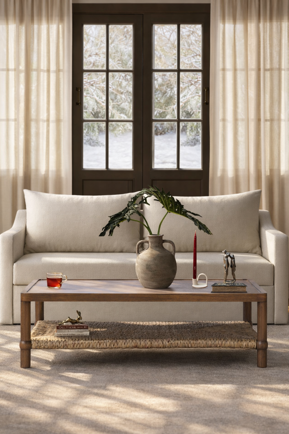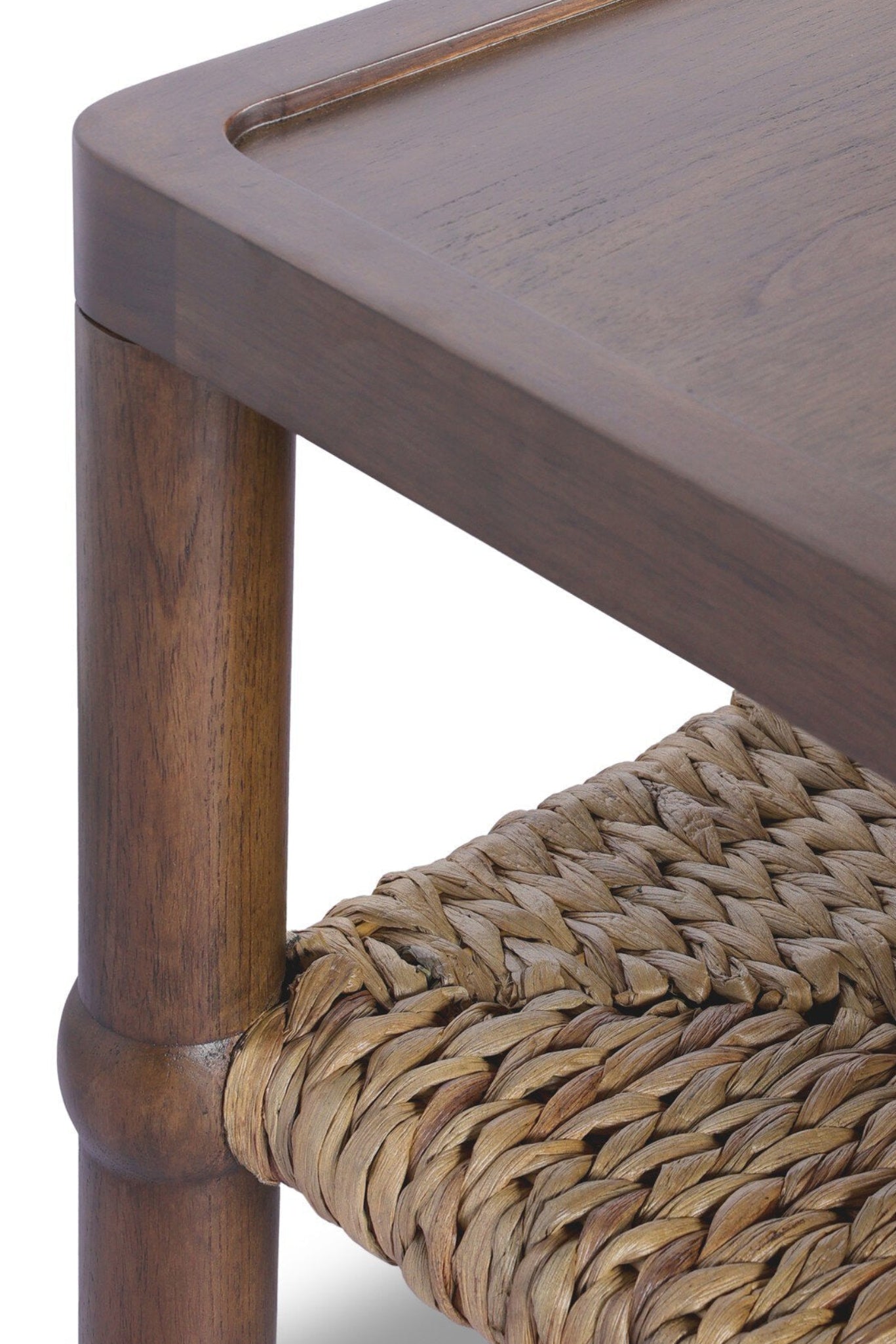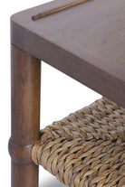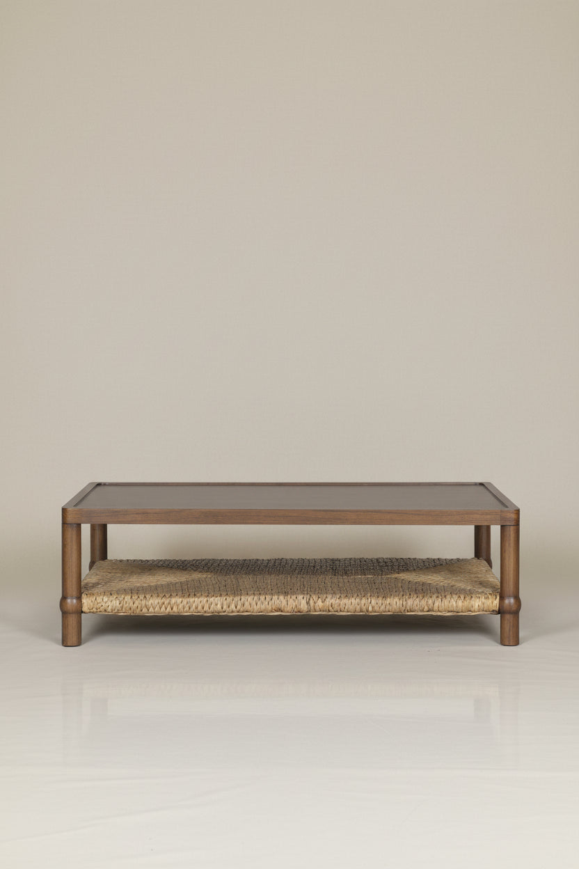 Mesa Ana donde la tradición se encuentra con el diseño contemporáneo. Esta mesa combina elegancia natural con funcionalidad práctica, presentando un estante tejido en jacinto de agua que envuelve delicadamente el marco de madera.