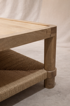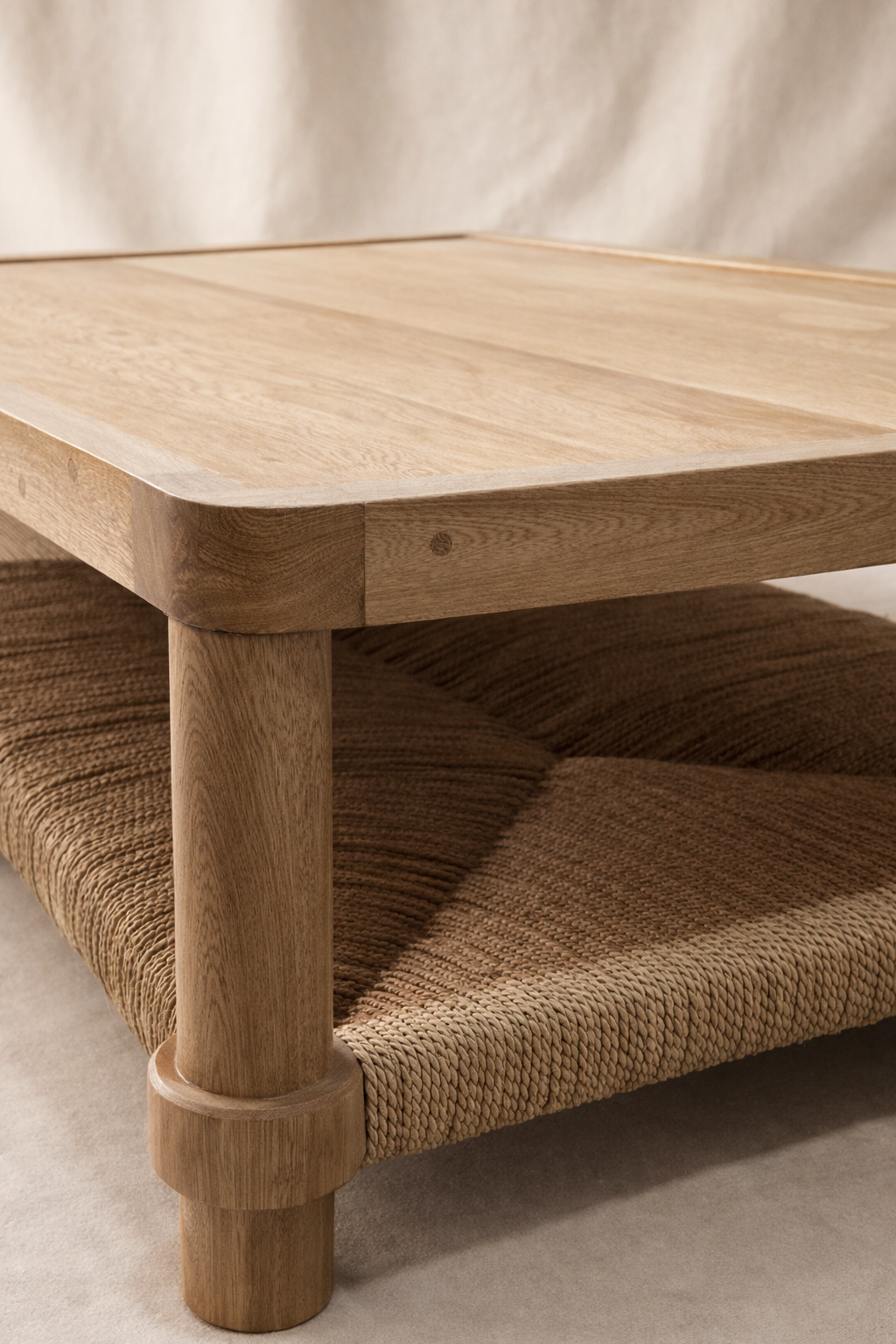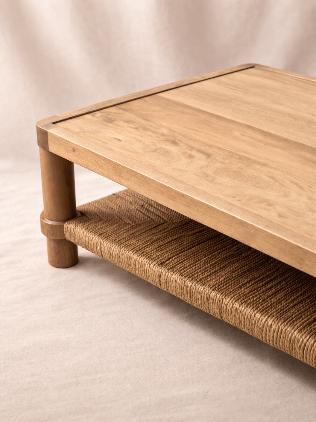 La estructura se compone de una cubierta con cantos boleados, patas ligeramente cónicas y travesaños que aportan estabilidad y continuidad visual. En la parte inferior, un entrepaño de tejido natural de alga marina trabajado de forma cruzada añade textura y funciona como superficie de apoyo.