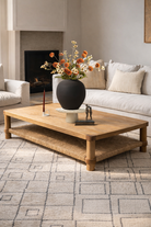 La Mesa Carmen de Casa Castañas está pensada para integrarse en salas y espacios de convivencia donde se busca una pieza cálida, ligera visualmente y con presencia natural. Su diseño permite que los materiales sean los protagonistas, destacando la relación entre madera y tejido.
