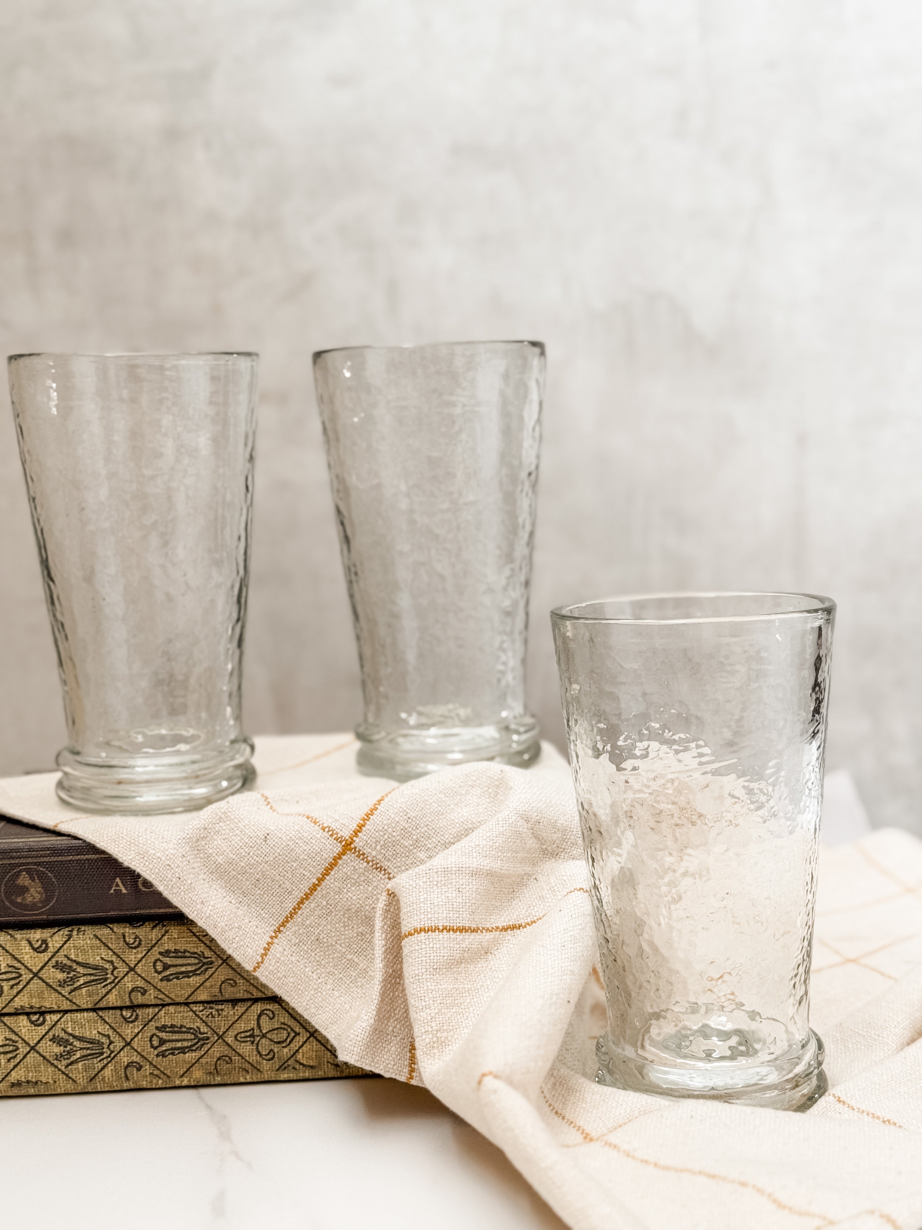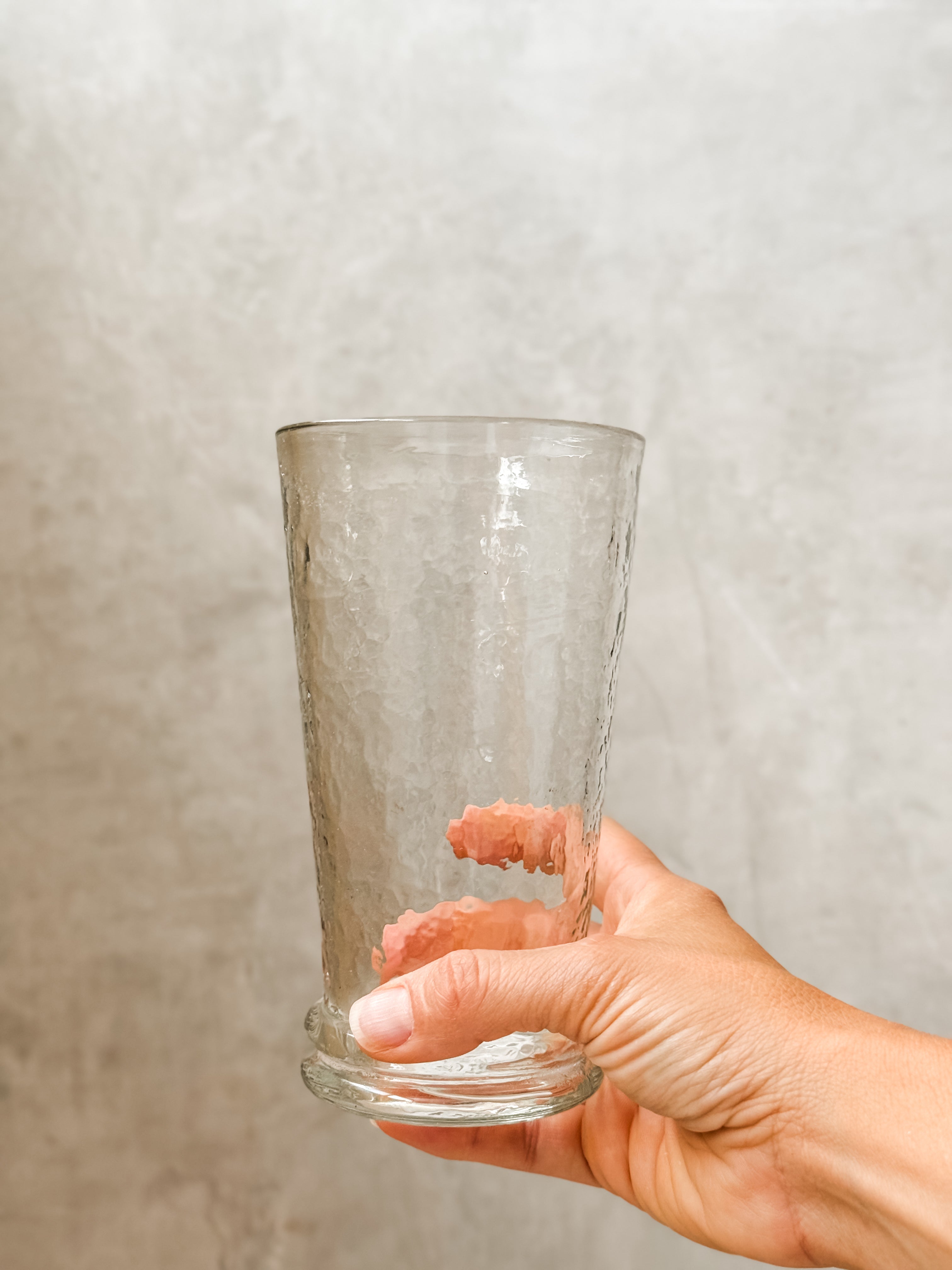 Bonito vaso de cristal, perfecto para acompañarte en tu mesa. Sus medidas son 17 cm de alto x 9 cm de diametro.